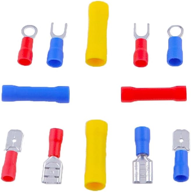 Descriptions: 1200pcs Insulated Terminals Electrical Crimp Connector Butt Spade Ring Fork Set and Insulated crimp terminals,Assorted crimp terminals and come with case,All are enclosed in plastic case for easy access.Specifications: 1200pcs assorted crimp terminalsMaterial : Copper + PVC + TinplateThe assorted crimp terminals is including :1200 Pcs80pcs RV1.25-3 Red80pcs RV1.25-4 Red80pcs RV1.25-5 Red80pcs SV1.25-3 Red80pcs SV1.25-4 Red50pcs BV1.25 Red70pcs MDD1.25-250 Red70pcs FDD1.25-250 Red80pcs RV2.0-3 Blue80pcs RV2.0-4 Blue60pcs RV2.0-5 Blue80pcs SV2.0-4 Blue50pcs BV2.0 Blue70pcs MDD2.0-250 Blue70pcs FDD2.0-250 Blue40pcs RV5.5-5 Yellow40pcsRV5.5-6 Yellow40pcsBV5.5 Yellow Quantity : 1400PcsMaterial : Copper + PVC+ TinplateFeatures:* Red : Suits cable/ wire sizes (0.5-1.5mm⊃2. 22-18AWG)*Blue : Suits cable/ wire sizes (1.5-2.5mm⊃2. 16-14AWG)*Yellow : Suits cable/ wire sizes (4.0-6.0mm⊃2. 12-10AWG) Allows visual inspection, prevents corrosion, and provided a waterproof seal.Can be ideal used in marine and automobile applications. and long service life.Easy to install.Package includes:1400 x Insulated Electrical Connectors Terminals100pcs RV1.25-3 red100pcs RV1.25-4 red100pcs RV1.25-5 red100pcs SV1.25-3 red100pcs SV1.25-4 red50pcs BV1.25 red75pcs MDD1.25-250 red75pcs FDD1.25-250 red100pcs RV 2-3 blue100pcs RV 2-4 blue80pcs RV 2-5 bl
