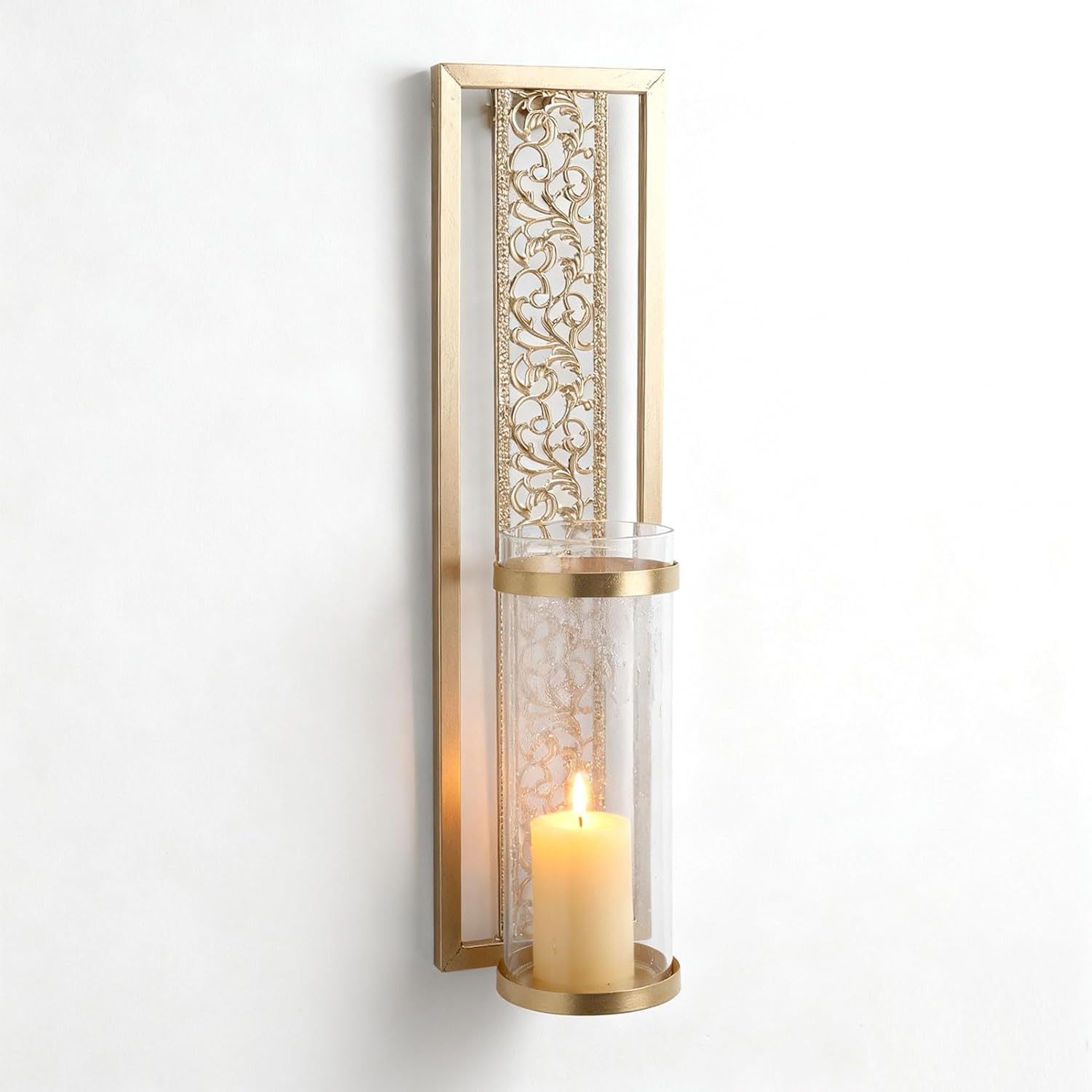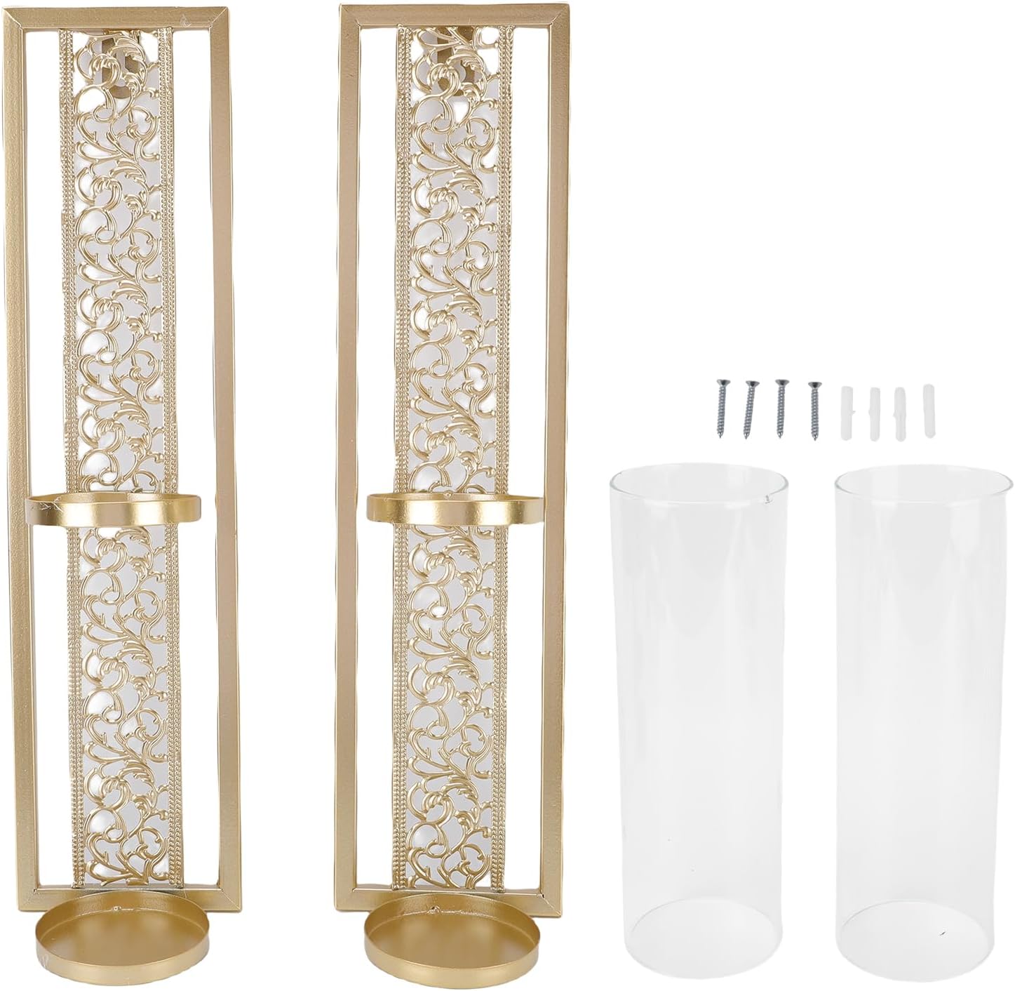Spec: Item Type: Wall Candle Holder Material: Iron, Glass Weight: Approx. 1245g / 43.9oz Wall Candle Holder Size: 40cm / 15.75in Glass Tube Size: Approx. 6.9x20x7.2cm / 2.72x7.87x2.83in How to Use: Install and directly use Package List: 2 x Wall Candle Holder 2 x Glass Tube 2 x Screw 2 x Expansion Tube