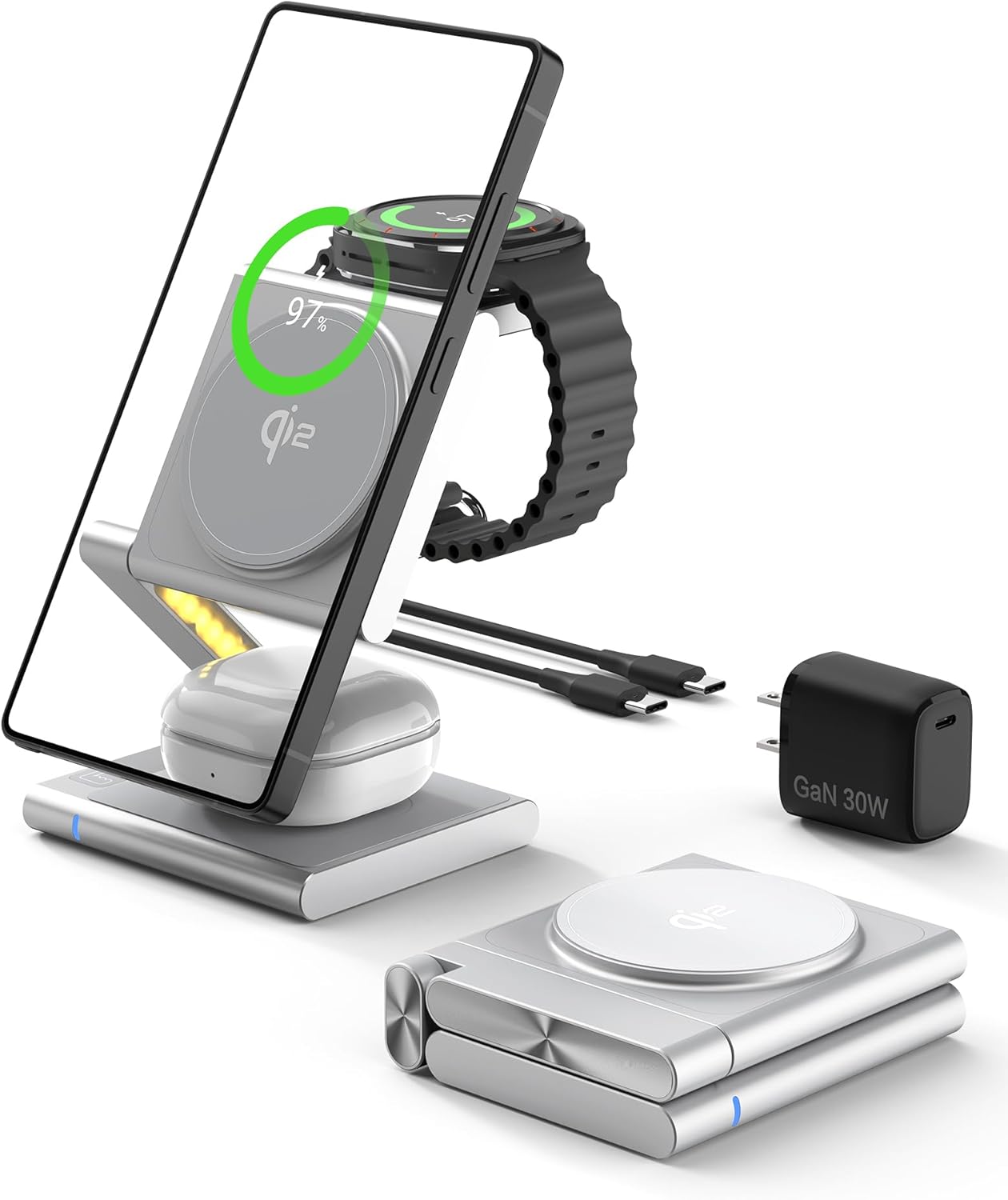 | Compatible Phone Models | 15W Max for Galaxy S25 Ultra/S25 Plus/S25/ S24 Ultra/S24 Plus/S24/S23 Ultra/S23 Plus/S23 /S22 Ultra/S22 Plus/S22/S21 Ultra/S21 Plus/S21; Galaxy Z Fold/Z Filp 7-1 series; Galaxy 20-S9 series and other Phone, 3W Max for Galaxy Watch 8/Watch 8 Classic; Watch Ultra; Watch7; Watch6 Classic/6; Watch5 Pro/5; Watch4/4 Classic; Watch3(Not for Galaxy Watch (2018), GalaxyGear 1/2/live/S/S3/S2/S4/Sport; Galaxy Gear Fit/2/3/Fit e; Watch Active/2), 5W Max for Buds. (For iPhone 12-17 series, it supports magnetic charging with the phone alone or with magnetic case) |