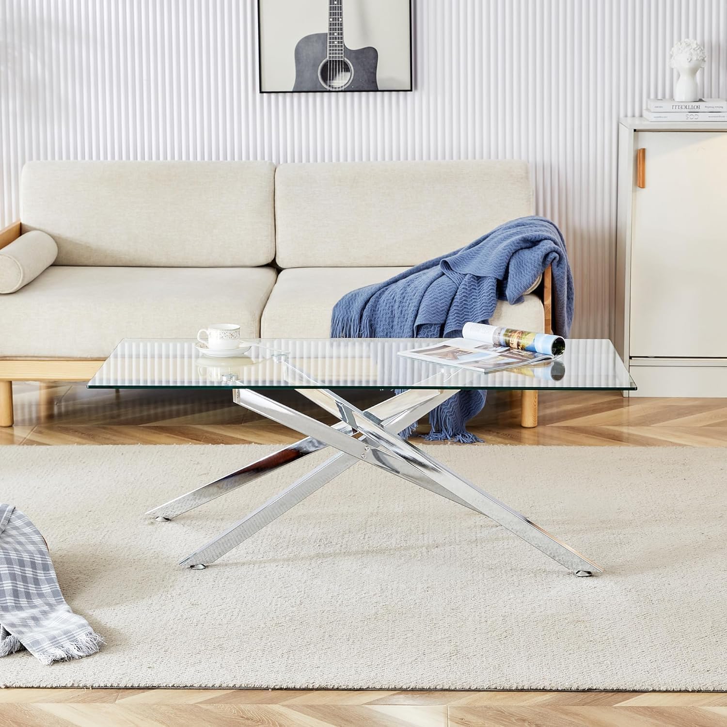 Thickened Glass Top This rectangle coffee table is made of high-quality tempered glass which makes the table top resistant to liquids, food stains, oil, heat, scratches, and easy to clean. Let your family and friends can share precious moments together and feel the beauty of life. Heavy-duty Metal Base The concrete coffee table features a durable tempered glass top and a high-quality metal legs, providing firm construction and reliable durability to withstand years of daily use in your home. Modern and Luxury Design The luxury appearance, minimalist style and silver metal frame which adds a bright and clean look to your space, suitable for a variety of decor styles, like modern, mid century, farmhouse, rustic, retro, industrial decor and more. Large Coffee Table The 47 inch long tabletop is spacious enough to hold your favourite decorations and makes room more pleasant and comfortable. You can place this glass coffee table in front of the sofa which will provides you a perfect space to fully relax and relieve fatigue after a busy day. Specification Tabletop Material: Tempered Glass Base Material: Chrome Metal Simple Assembly Required: Yes Package Included: 1 x Coffee Table