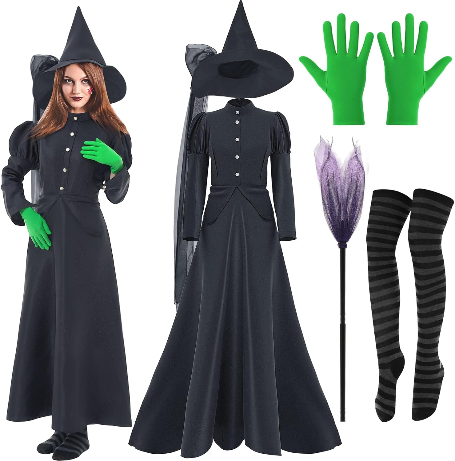 Features: Complete Matching Accessories: This witch costume adult dress set comes with a matching witch hat, detachable broom, green stretch gloves and striped thigh-high socks, ensuring every piece fits together perfectly for a coordinated look from head to toe. Easy to Store and Reuse: Each piece in this women's witch costume kit is lightweight and can be folded or disassembled for simple storage. The detachable broom design helps save space and makes packing for travel, cosplay shows or Halloween gatherings hassle-free. Color: Classic Black Dress, Green Gloves, Black Hat, Striped Black & White Socks, Black Broom Handle Size: M Material: Witch dress & hat: Soft, durable, lightweight, breathable fabric (hand wash only) Green gloves: Spandex Striped purple socks: Polyester Witch broom prop: PVC & mesh fabric Note: Due to manual measurement, slight size differences may occur. Color may vary slightly under different lighting or screen settings