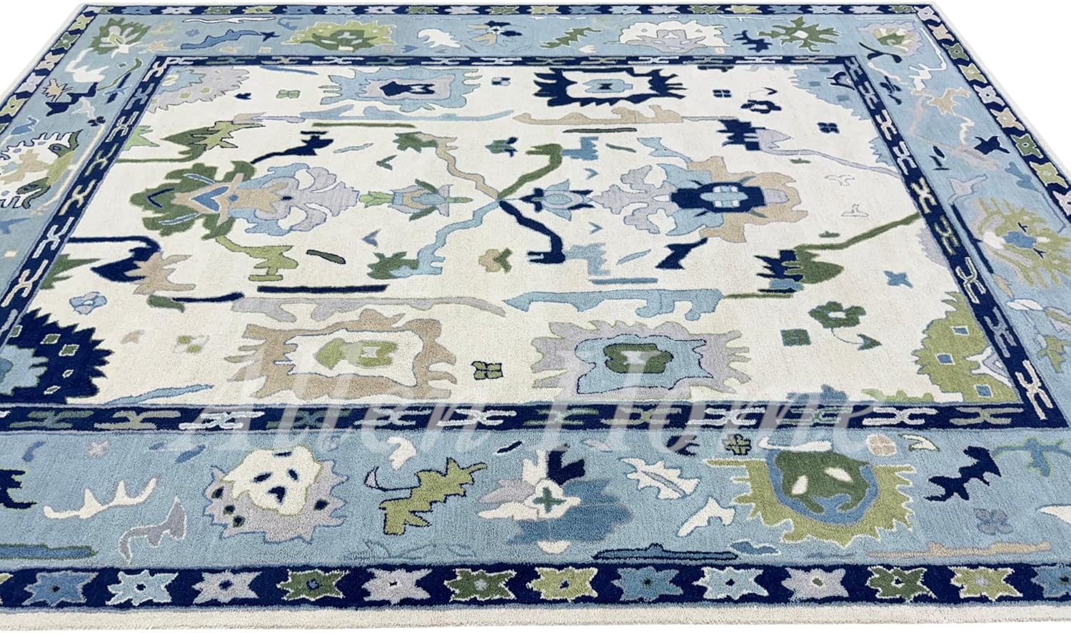 Allen Home Hand Crafted Wool Rugs | Pastel Ushak Area Carpets Suitable for Living Room, Bedroom, Dining Room | Natural Latex Backing with 100% Cotton | Oushak Caroline Blue & Beige - 8’ x 10’