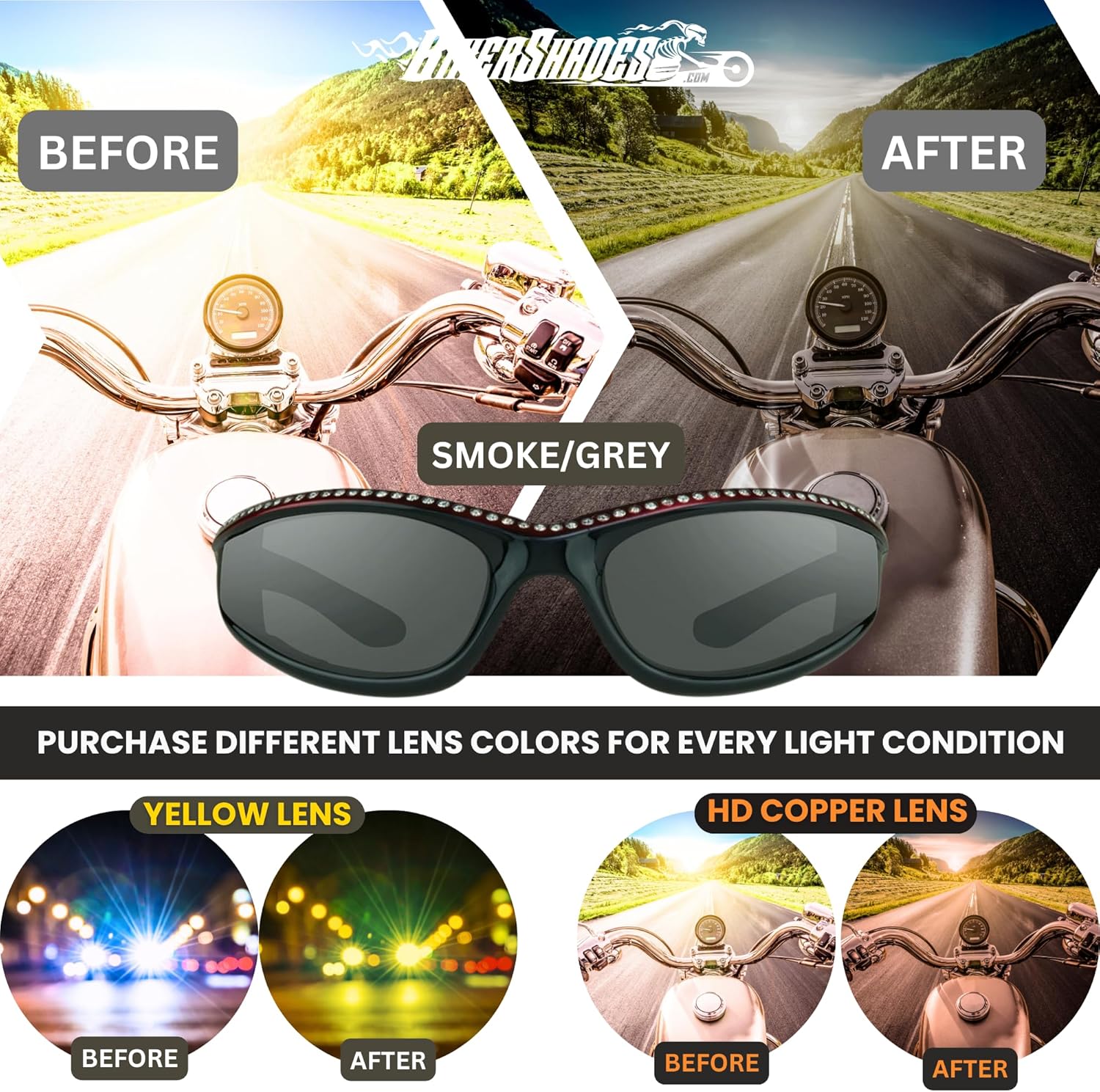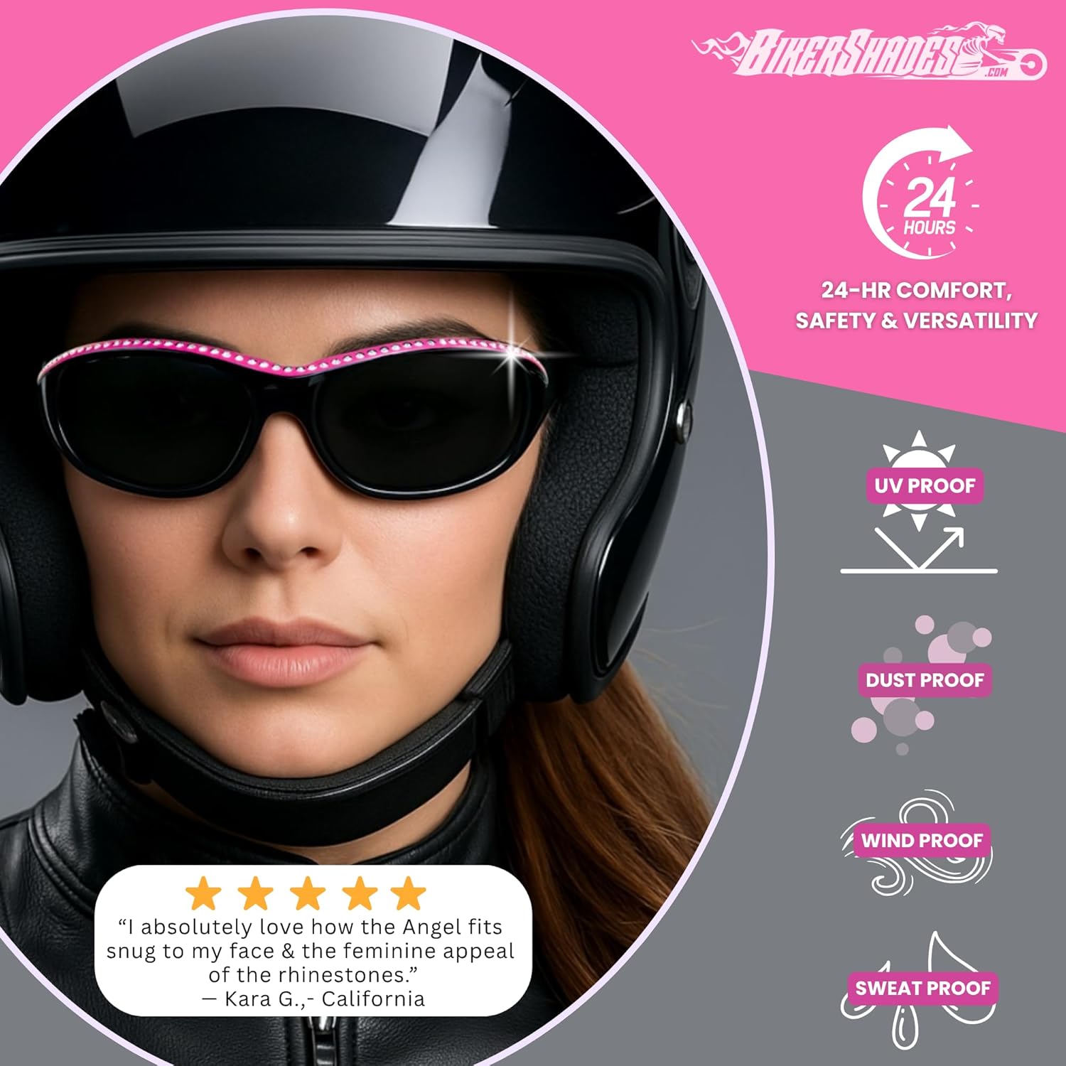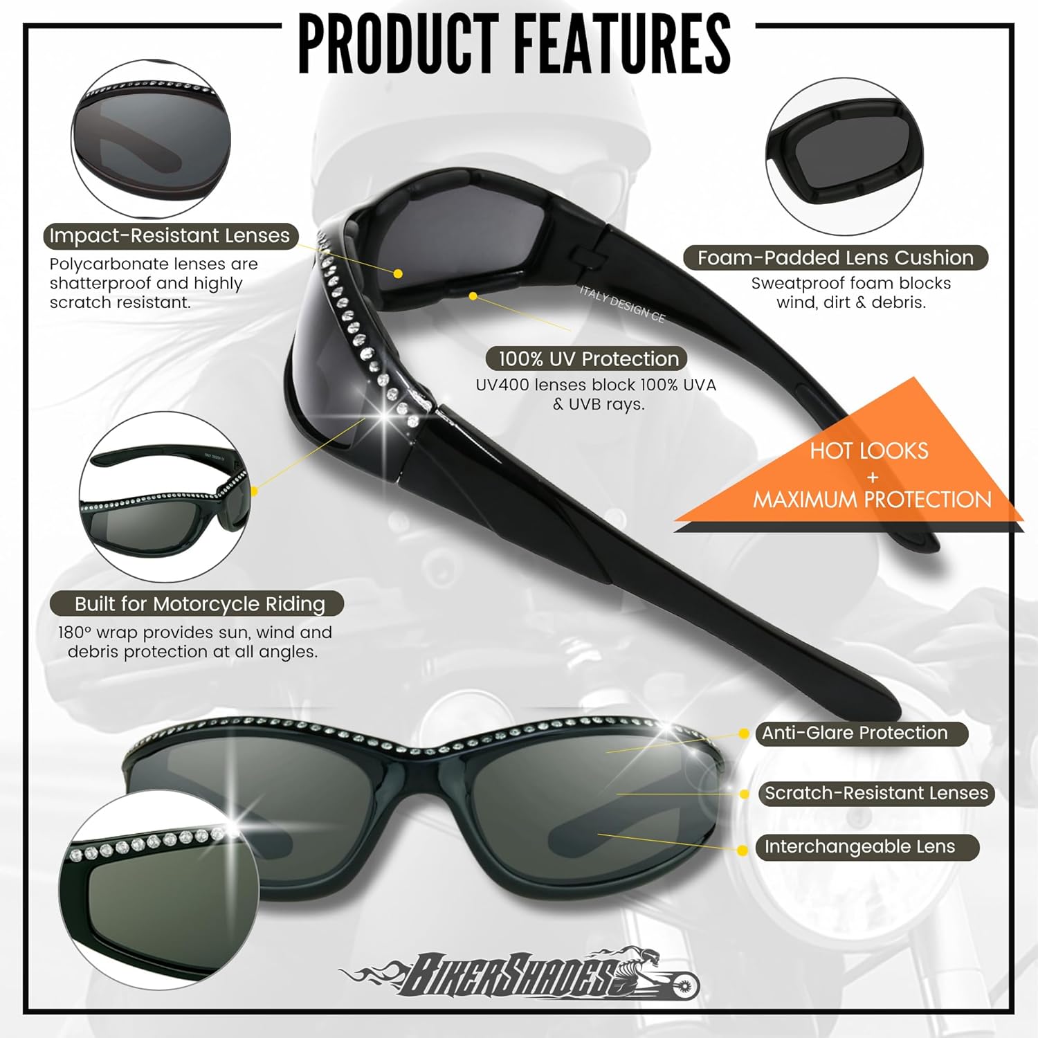 One of the most popular Motorcycle Riding Glasses for Women - Angel is now available with cute and trendy rhinestones frames!Angel Motorcycle sunglasses provide aggressive styling with a sick, bold stripe across the top of the frame.Frames are equipped with a soft SWEAT PROOF foam cushion in the frame to seal out wind, dust and debris while you are riding.Lenses are impact resistant POLYCARBONATE, NOT acrylic, and provide 100% UV protection.