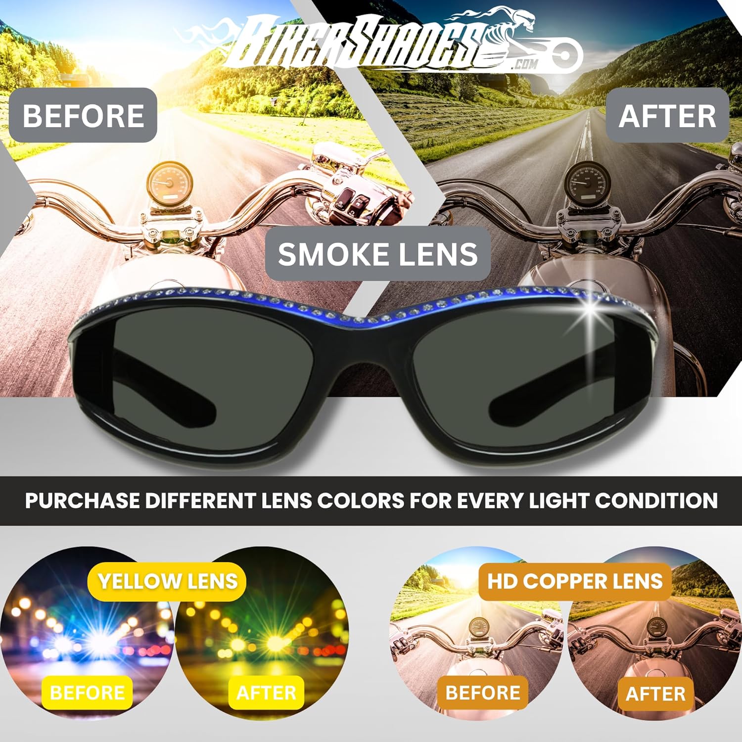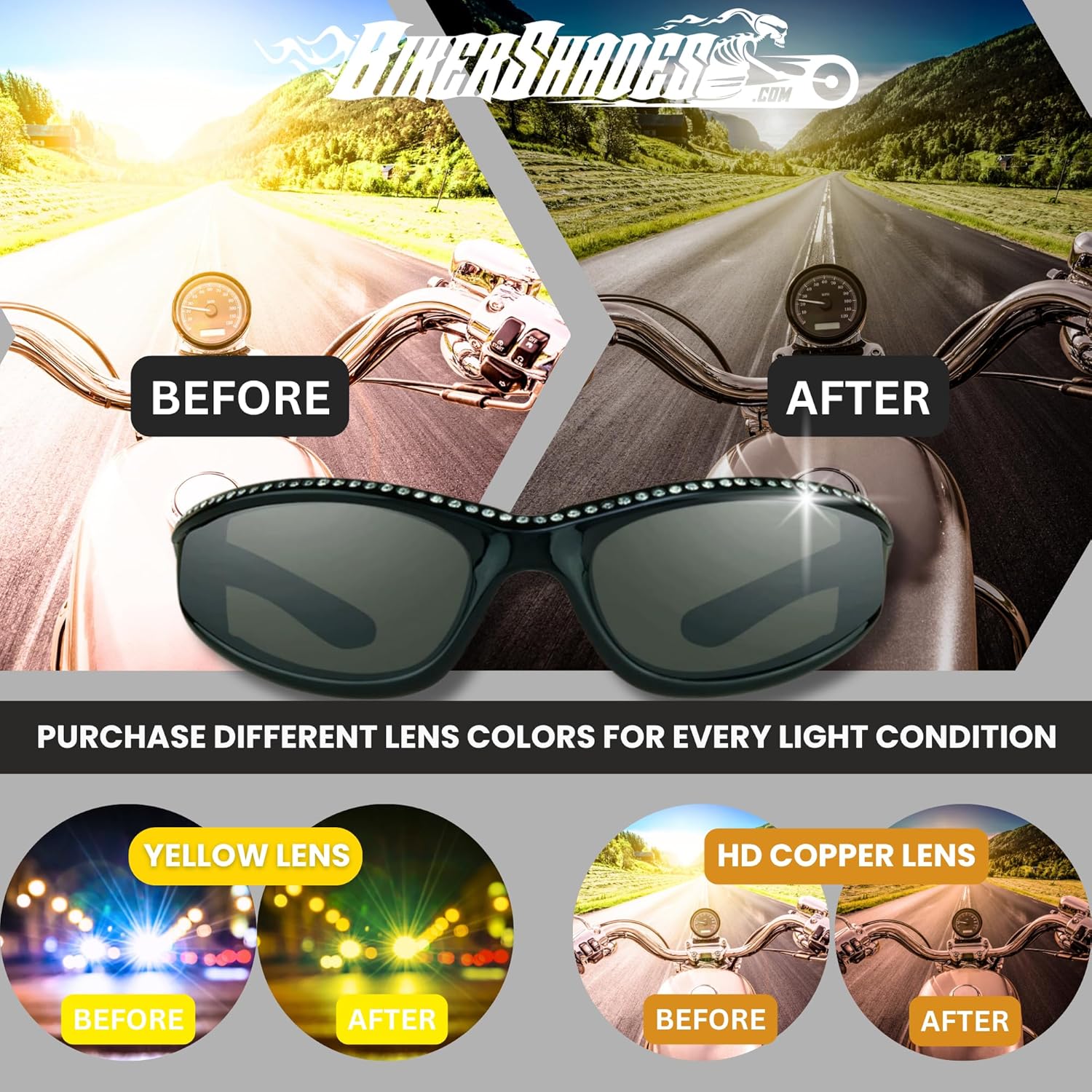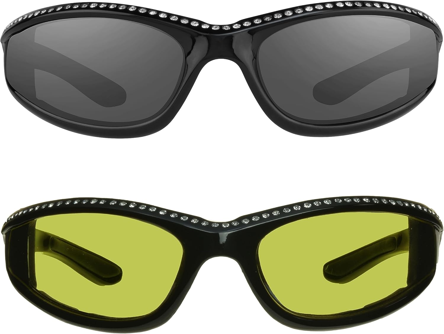 One of the most popular Motorcycle Riding Glasses for Women - Angel is now available with cute and trendy rhinestones frames!Angel Motorcycle sunglasses provide aggressive styling with a sick, bold stripe across the top of the frame.Frames are equipped with a soft SWEAT PROOF foam cushion in the frame to seal out wind, dust and debris while you are riding.Lenses are impact resistant POLYCARBONATE, NOT acrylic, and provide 100% UV protection.