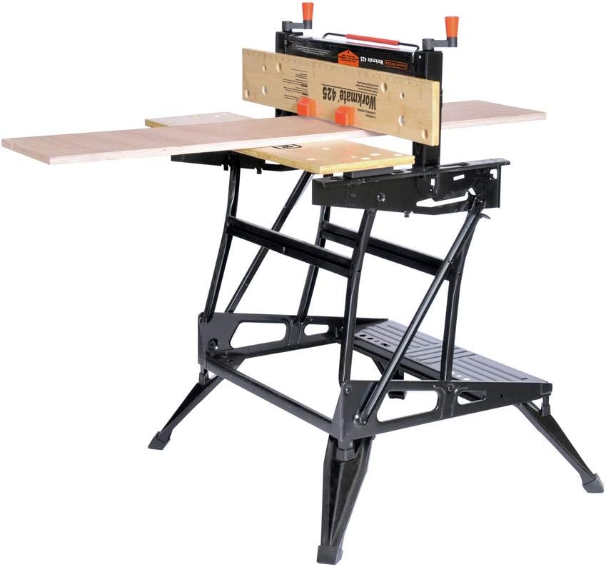Product Description The most versatile workbench on the market, the Workmate 425 comes with an advanced one-handed clamp system with exclusive clutch design for easy clamping, and a front jaw that swings up for vertical clamping. It folds for easy storage, and has a strong steel construction and holds up to 550-Pound. Its dual height allows for use as a workbench, bench tool stand, vise, or sawhorse. Included Components: WM425 Project Center, (4) Swivel Pegs From the Manufacturer The most versatile workbench on the market, the Workmate 425 comes with an advanced one-handed clamp system with exclusive clutch design for easy clamping, and a front jaw that swings up for vertical clamping. It folds for easy storage, and has a strong steel construction and holds up to 550-Pound. Its dual height allows for use as a workbench, bench tool stand, vise, or sawhorse.