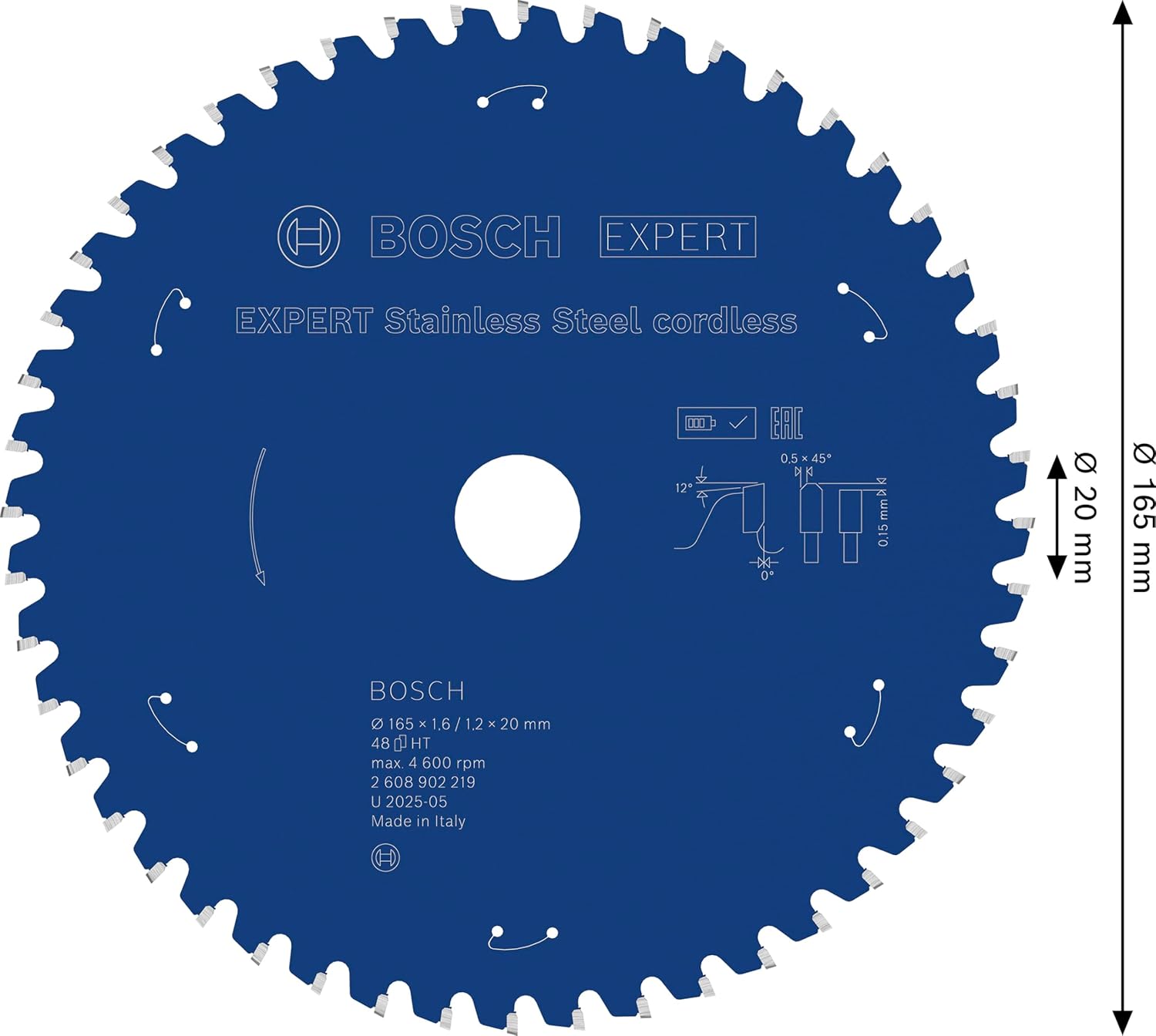 | Included Components | Expert stainless steel cordless circular saw blade, 165 × 1.6/1.2 × 20 mm, T48 |