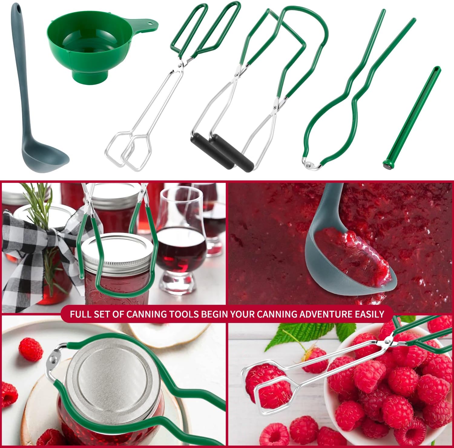 • [Full Canning Supplies Starter kit]:The full canning supplies starter kit includes a canning pot,a canning rack,a canning spoon,and a set of canning stickers,a canning funnel,a pair of canning tongs,a jar lifter,a magnetic lid lifter(No Dishwasher),a canning wrench.Well-equipped canning tools can speed up the canning process and reduce prep time.
