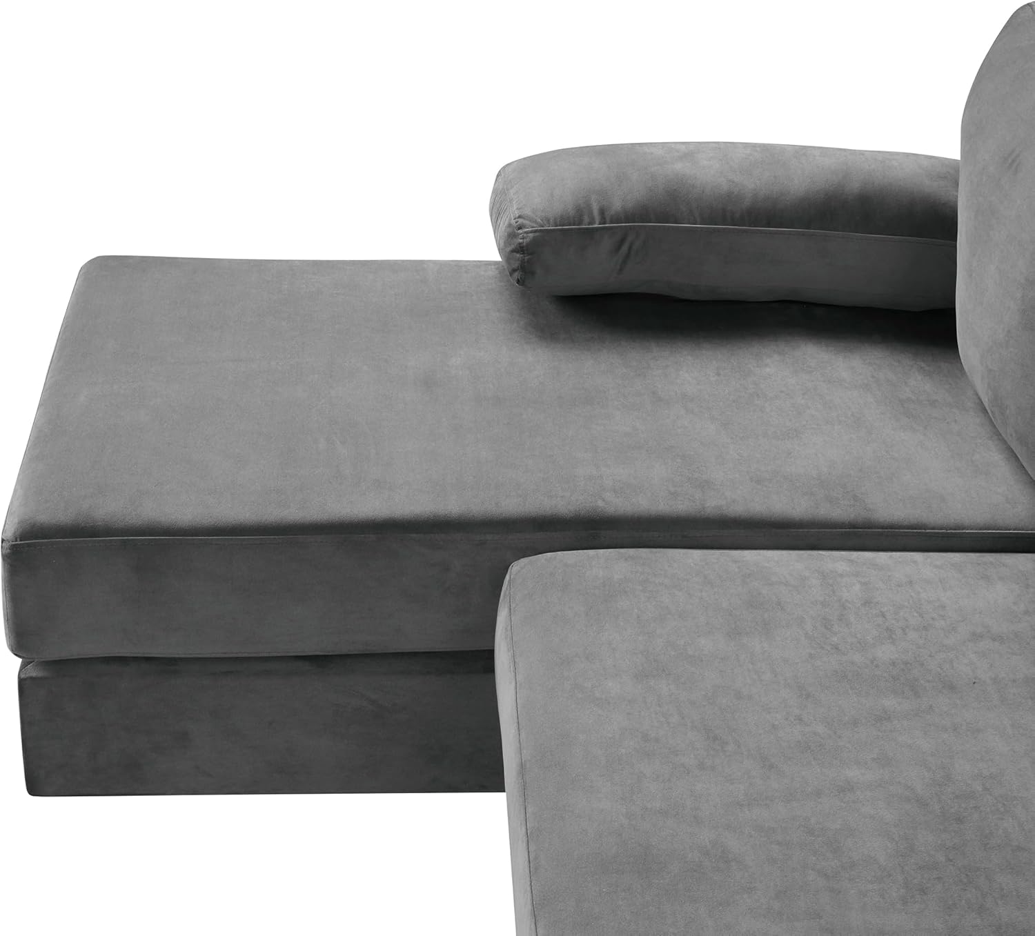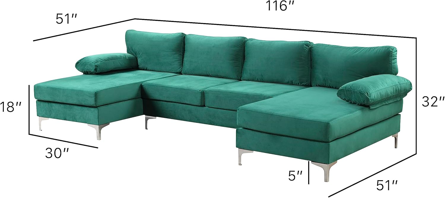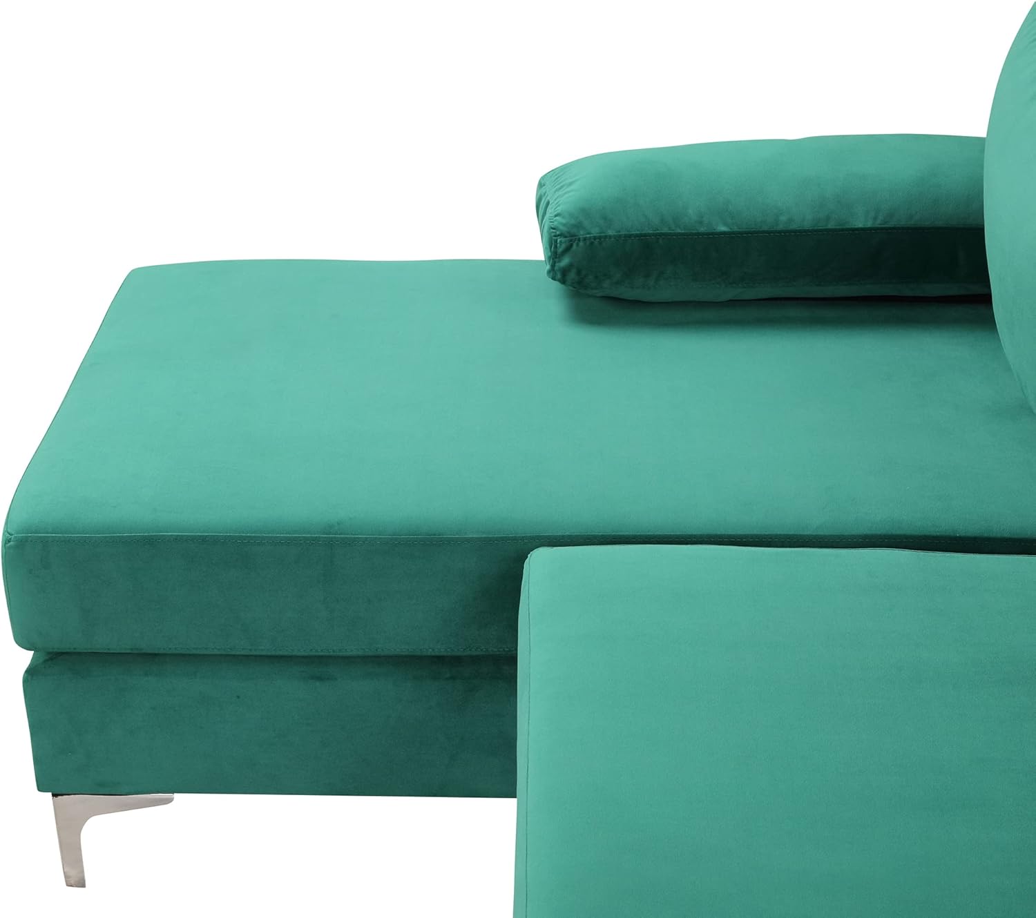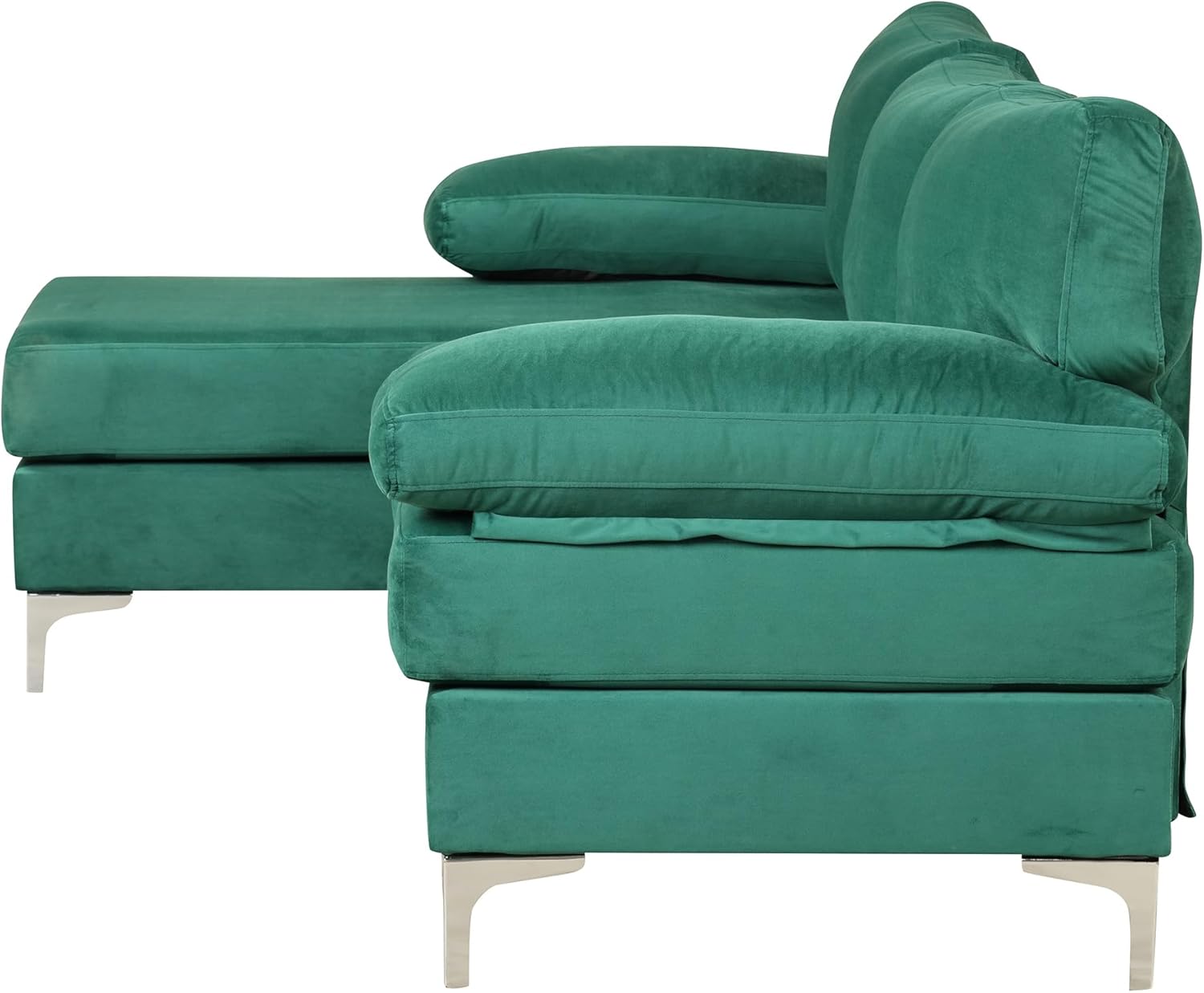 Family room / living room sectional sofa with an extra wide chaise lounge for maximum comfort Ultra soft and durable velvet fabric upholstery loose back pillows for a plush look and feel 5 people can sit comfortably in this couch Available in various fun and vibrant colors to best fit your home decor Plush and durable memory foam seat cushions Some assembly is required - Assembly instructions and hardware included