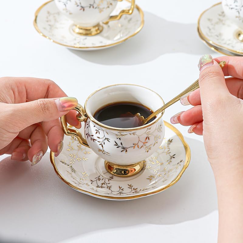 Ceramic coffee mug and saucer set, 3.5 oz small coffee mug set, teacup set, small coffee mug with gold rim design, for espresso cappuccino cup for latte, mocha - gold/white