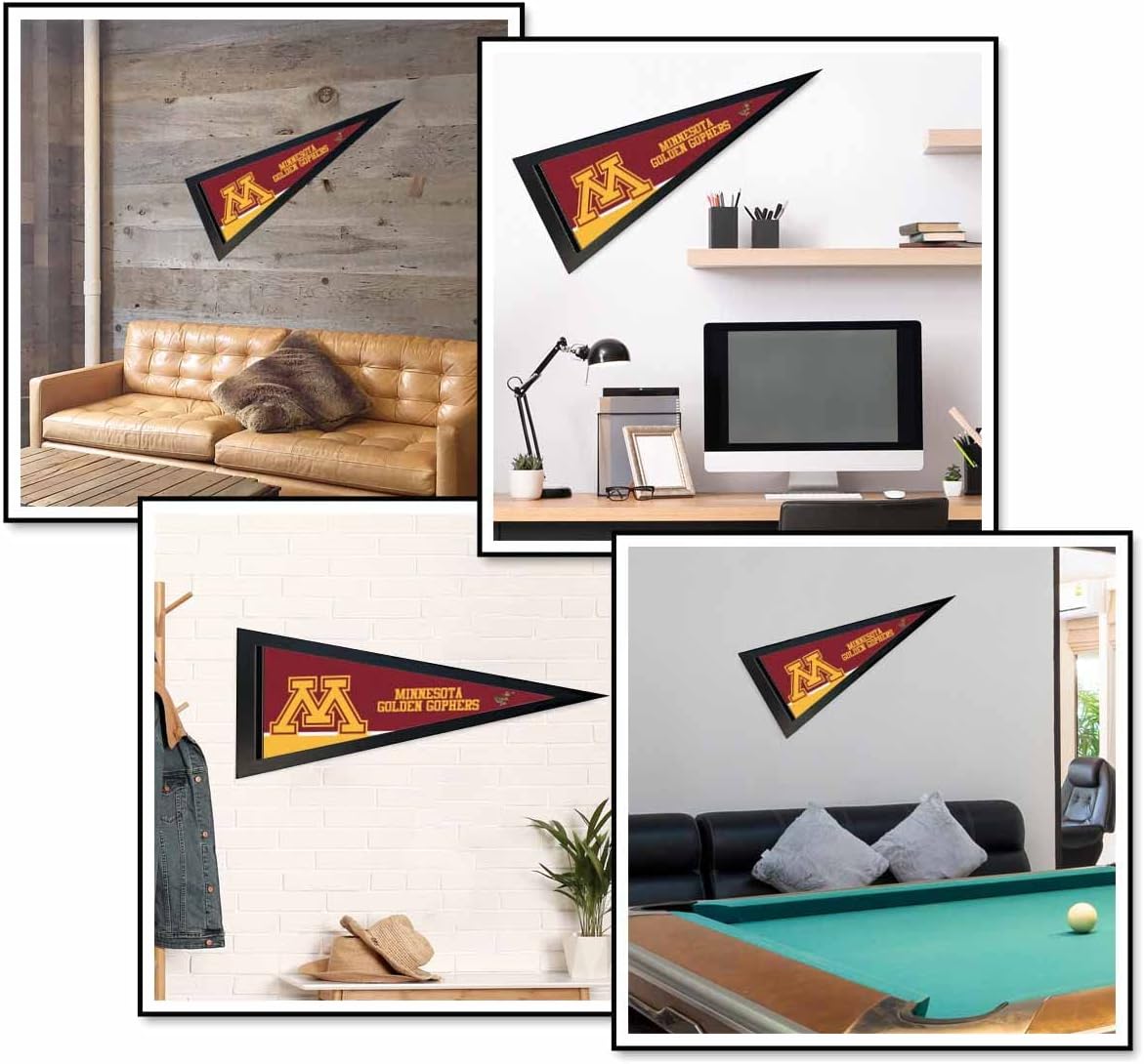 University of Minnesota Gophers Pennant and Wood Pennant Frame includes a 12x30 inch soft poly felt Officially Licensed pennant and the recommended Pennant Frame which is made of solid poplar wood.The pennant is full size, single sided screen printed, and is ideal to display on any wall of your home, office, gameroom, or as a banner. The Pennant Frame is 13.25 x 34.25 inches, made of poplar wood moulding, stained black satin, includes a plexiglass front, and fits this pennant perfectly. Please Note: The pennant frame has a protective plastic film on both sides of the plexiglass. Please peel off from both sides when ready to use.