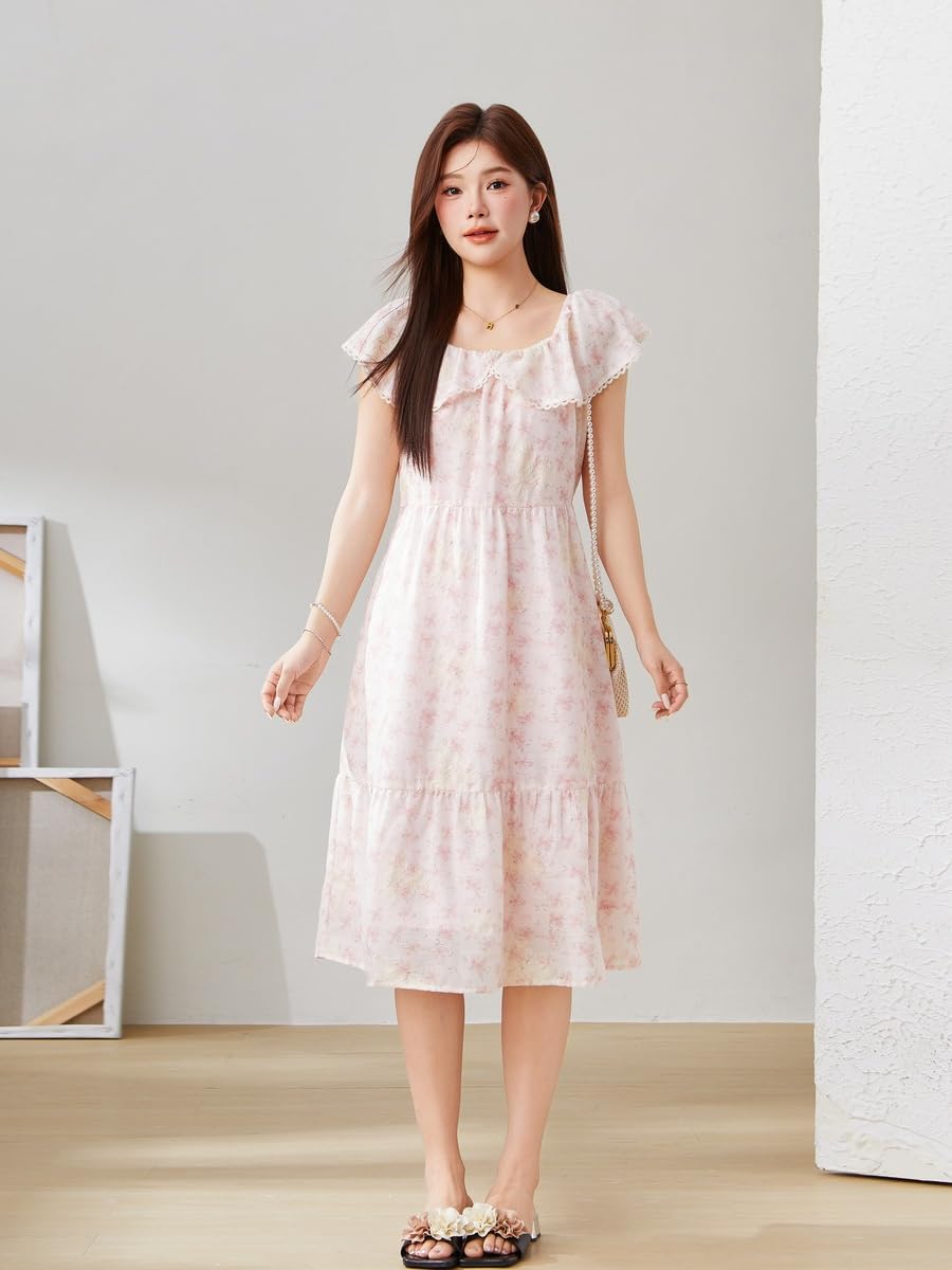 Pattern: floral Brand: CAIDOBLE Part Number: EXQ5350 Fabric name: Polyester Skirt type: A-shaped skirt Color: pink, green Sleeve type: lotus leaf sleeve Main fabric composition: polyester (polyester fiber) Size: L, XL, 2XL, 3XL, 4XL, 5XL Main fabric composition content: 95% and above Gender: Female Style Type: Temperament Commuter Applicable age group: adult Collar type: Doll collar Skirt length: long skirt Sleeve length: three-quarter sleeve Popular element: ruffle Style: Elegant style