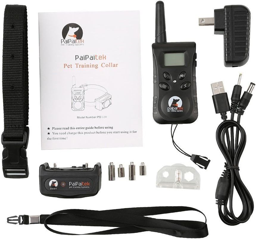 specification: Receiver belt length: 65cm / 25inch Fit for : from 12" to 24" around the neck (for most large,medium and small-sized dogs.) Range: 500 yards(without any disturbance) Levels of vibration: 1-100 level adjustable Levels of static shock: 1-100 level adjustable modes: static shock/vibration /sound. Frequency: 433.825 MHz Transmitter: 3.7V 500ma Receiver: 3.7V 500maI Colour: Black Weight: 320g Waterproof: YES (Collar) Energy-saving design:automatic stand by model and memory functions. Caution: The Remote Transmitter is non-waterproof, please do not submerging the remote in water, it will cause damage.