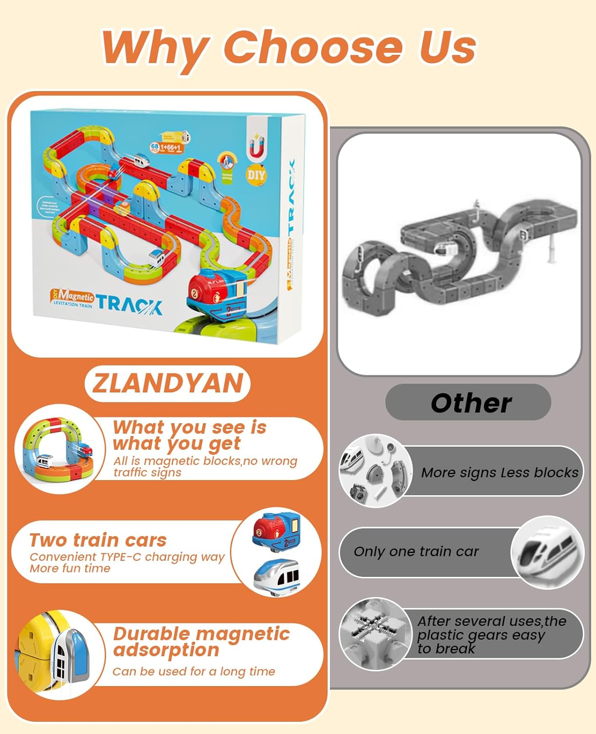 • High-Quality & Child-Safe: We prioritize premium craftsmanship and child-friendly design for toddlers.This train set is constructed with high-grade materials, featuring strong magnets that keep pieces securely connected—eliminating choking risks and ensuring full safety compliance through rigorous testing. The track cubes boast smooth, rounded edges to protect your child's delicate skin during play.