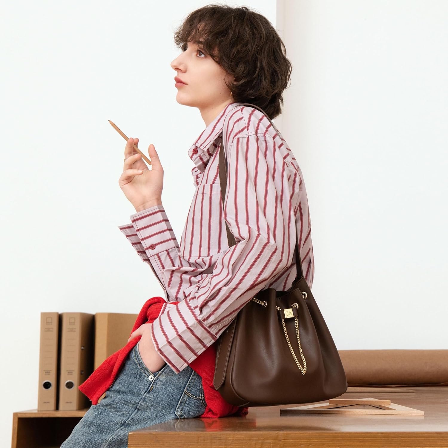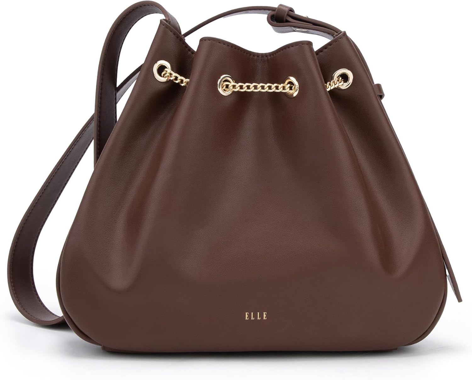 ELLEShoulder Bags for Women, Medium Genuine Leather Bucket Bag, Crossbody Handbag (Black/White/Brown)PRODUCT DETAILSMaterial: split leatherLining: microfiber leatherColor: black, white, brownHardware color: goldAdjustable shoulder strapInternal details: internal slot pocket, single compartmentClosure: chain drawstringIncludes: dust bagSIZE & FITWidth: 11.22in / 28.5cmHeight: 8.86in / 22.5cmDepth: 1.97in / 5cmMin. Strap Length: 23.62in / 60cmMax. Strap Length: 31.5in / 80cmFits: iPhone Pro Max/Plus, Power bank, Airpods, Wallet, and lipstick.ELLE Bags are made with carefully selected materials. Please handle with care for longer product life.
