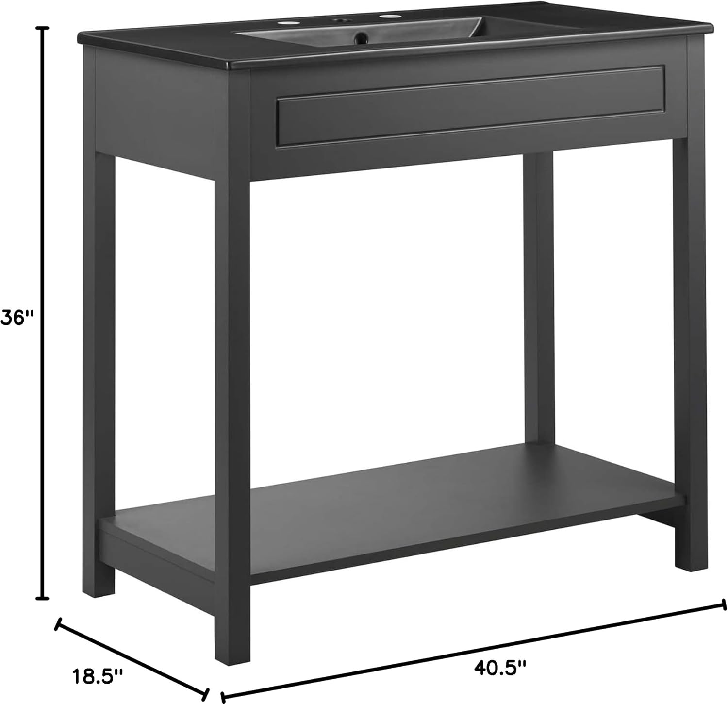 Introducing the Altura 36" Bathroom Vanity, the perfect addition to refresh and elevate your bathroom space. With its crisp, clean lines and streamlined design, this modern vanity exudes elegance and sophistication. Crafted with utmost durability in mind, the Altura vanity is constructed with painted MDF and particleboard, ensuring long-lasting quality. The inset detailing adds a subtle touch of visual interest, making this vanity a standout piece in any bathroom decor.Featuring an integrated ceramic sink basin with 8-inch centerset faucet holes, this vanity offers both style and functionality. The spacious countertop provides ample space for your daily essentials, while the open storage shelf allows you to showcase your favorite decor or store bathroom necessities within easy reach.To protect your flooring, the Altura vanity is equipped with non-marking foot caps, ensuring that your bathroom remains pristine. Please note that fixtures are not included, allowing you the freedom to customize and personalize your vanity to your liking.Assembly is required for this vanity, but rest assured, the process is straightforward and hassle-free. The set includes everything you need to assemble the Altura 36" Bathroom Vanity, making it convenient and easy to transform your bathroom into a stylish oasis.Product Dimensions:- Overall Cabinet Dimensions: 17.5"L x 35"W x 34"H- Floor to Underside of Vanity: 27.5"H- Leg Dimensions: 1.5"H- Overall Sink Dimensions: 18.5"L x 36"W x 6.5"HUpgrade your bathroom with the Altura 36" Bathroom Vanity and enjoy the perfect blend of modern design, functionality, and durability. Trust in Ergode's commitment to quality and style to enhance your bathroom experience.