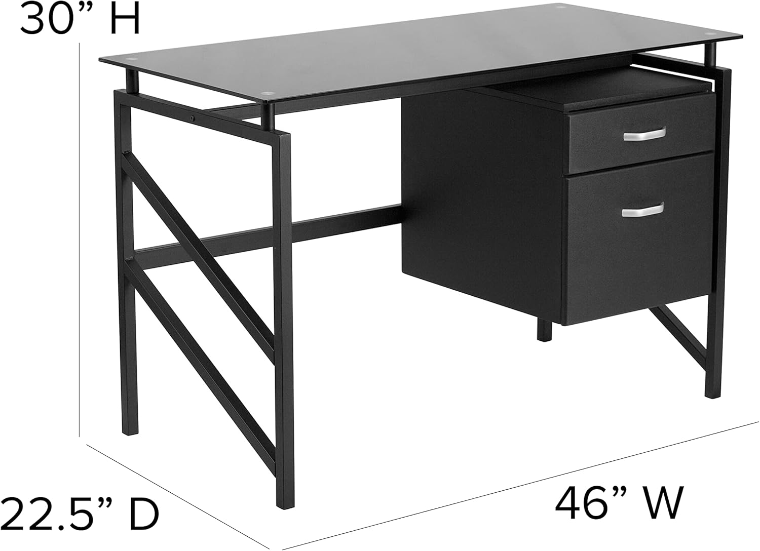 Gain a productive edge without sacrificing your sense of style with this glass top, two drawer pedestal computer desk. This desk is highlighted by a tempered black glass top that offers ample space to place your monitor, laptop, books, and writing materials. With an included hanging box/file pedestal you can store documents in the file drawer and items that you need more quickly in the box drawer. Whether you're just starting a business or have been on the job for years investing in a computer desk with storage will work in your favor.