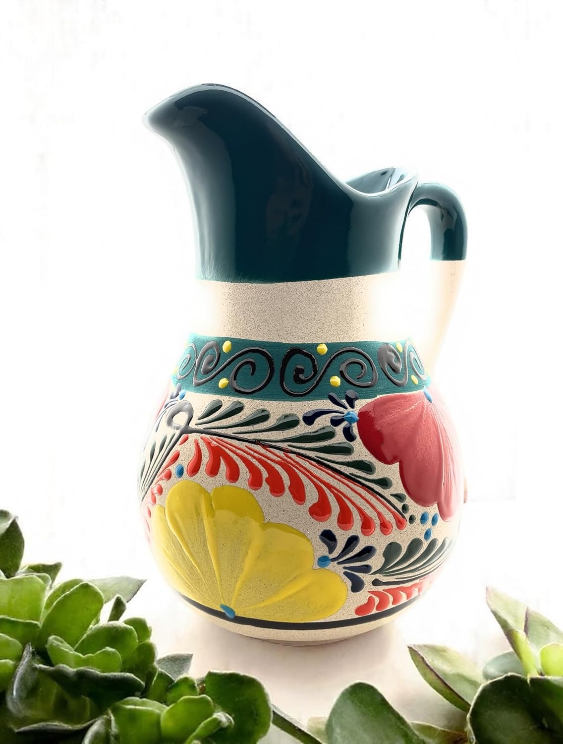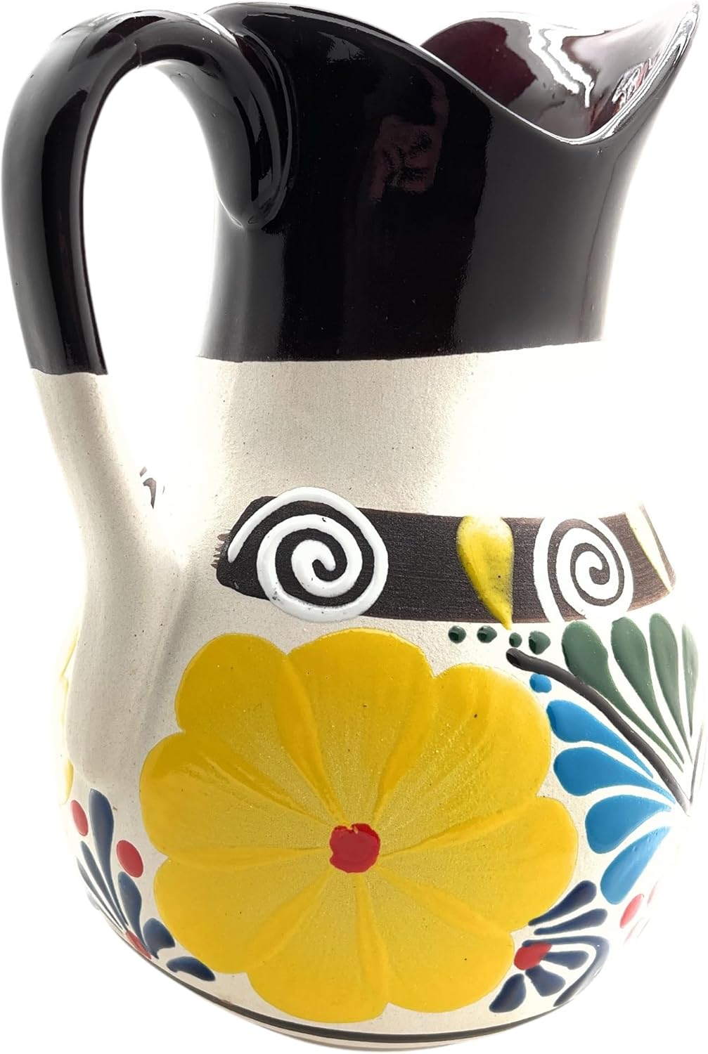 The mexican Jarra is great to complete your cantaritos set. keep drinks cold or hot because the temperature doesn't change fast in clay. This is about 12 inches tall and about 9 inches wide and with handle. Great for fiesta cold drinks or hot drinks. You will love it. These are all natural for a natural authentic look. This is hand painted and glazed so that you can use it for years to come and it is so beautiful for your decoration. Also makes a great gift. These are hand painted and can have a bit different colors or paterns than the picture because they are not mass produced and the makers want each one to be a little unique.