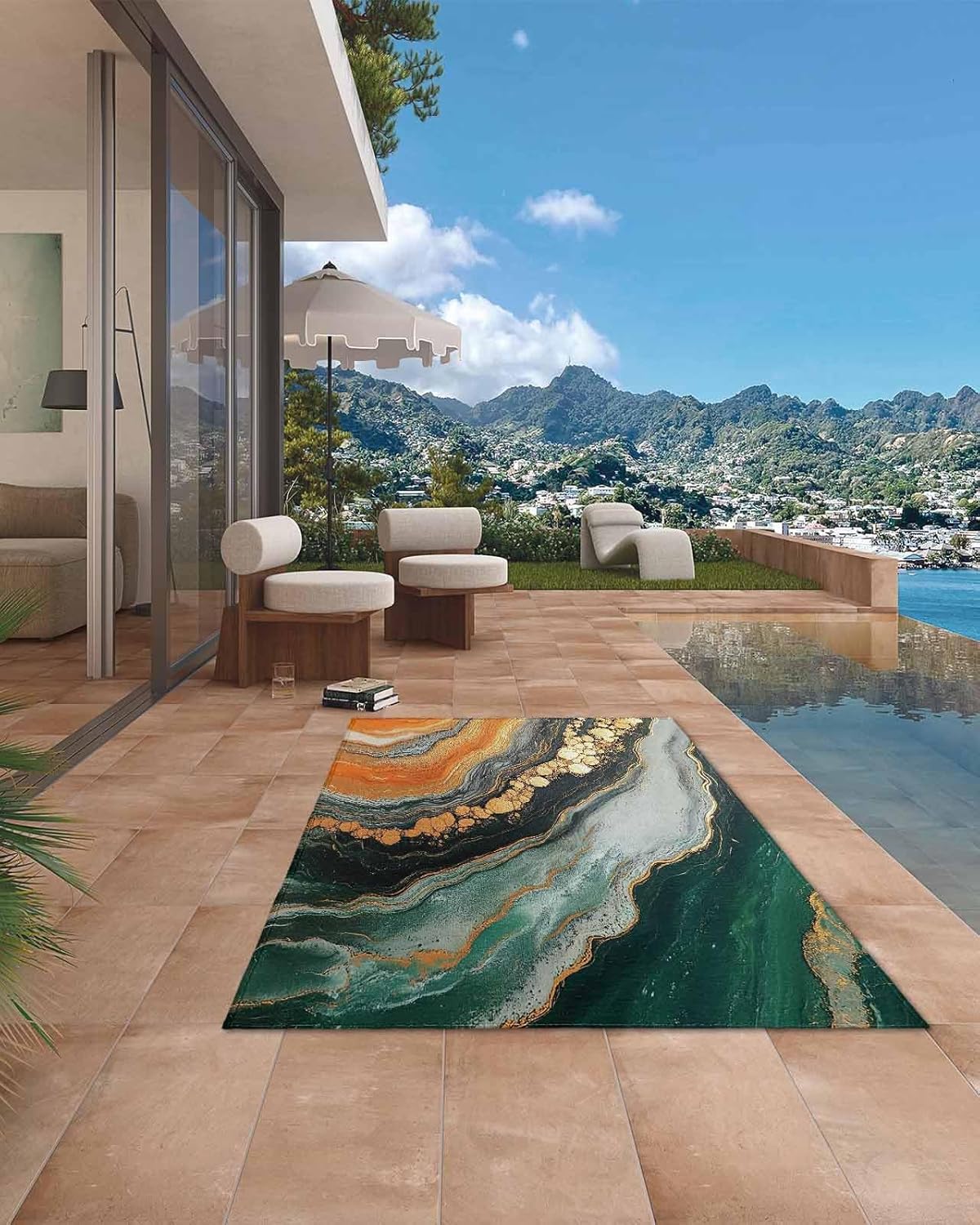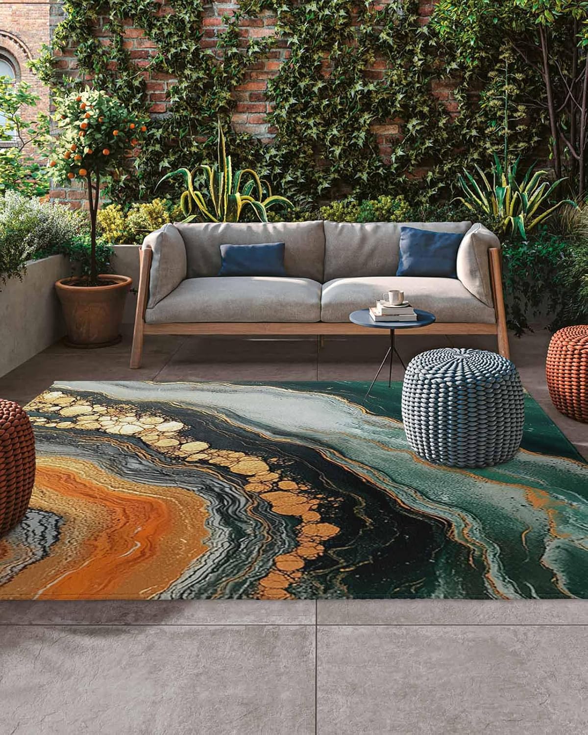 Enjoy supreme comfort and plush softness under your feet.Transform your existing decor with the chic modern style of our outdoor area rug carpet.Size4x6 ft5x8ft 6x9ftThickness measures: 0.2 in.Shape: RectangularBacking: Non-skip rubber points.Package includes:1 PC x Area RugsSpecial Note: Rugs may contain temporary creases upon arrival, allow time for creases to flatten and settle.How to remove carpet creases? 1. Wet the carpet and flatten it to air dry 2. Use a steam iron 3. Roll the area rug in reverse of the wrinkle or crease 4. Use a steam cleanerPremium MaterialMade from high-quality, soft, comfortable and strong durability. Provide a warmer and softer feel under your bare feet and knees, without damaging your deck or grass.Double-layer, outdoor mat is breathable, easy to clean, washable and quick dry.Multiple OccasionOutdoor rugs suitable for terrace, balcony, deck, garden, beach, porch, RV, camping, garage and other places.Versatile Mats Outdoor PatioThe outdoor rug can fit your patio style well, elegant as it is functional, not only protects the floor, but also adds a new view and to show off your personal style.Ideal Home DecorThe soft outdoor carpet is available in multiple colors and sizes to suit your different styles and needs, making it an ideal choice for home decoration.Wash TipsWhen the rug is dusty, only need to wash it with a hose outdoors.