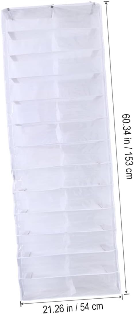 Package Include 1 x 26 Large Pocket Over the Door Hanger Shoes Organizer Closet Shelves Rack Hanging Storage Space Saver(White) Features - Size: Approx. 16.5 x 55 cm/ 6.5 x 21.6 x 5.12 inch (LxWxH) hanging storage for closet. - Material: Polyester and metal shoe storage organizer - mounting, to assemble, no extra required hanging shelves for closet. - ColorWhite hanging storage organizer - Includes a convenient hook to position the organizer over the door, closet or cabinet. Reasonably Utilizes the unused storage space the maximum degree hanging shoe rack storage holder. - A great over the door organizer space saver to keep your shoe collection neatly organized for a bedroom, closet, dorm room, , and other tight living spaces closet space savers. - Great large capacity, 26 divided shelves offer enough storage for pairs of shoes, slippers, belts, scarves and other small items and will save large space for your home shoes organizer.Goods Descriptionhanging shoe rack storage holder Idea for space saving for your home in no time.closet storage Still confused with the messy shoes on the floor or the space of the shoe shelf for storage? Well, let's bid farewell to these trouble with thisover the door hanger shoes organizer, this hanger comes with 26 large pocket which can hold up to 26 pairs of shoes and some other small items such as hats, clothing accessories, bath and shower accessories, and other personal supplies.over door shoe storage It's assembled with reinforced metal frame and hooks for solid and strong holding, you can quickly and easily it over a closet or bedroom door for neat and orderly storage