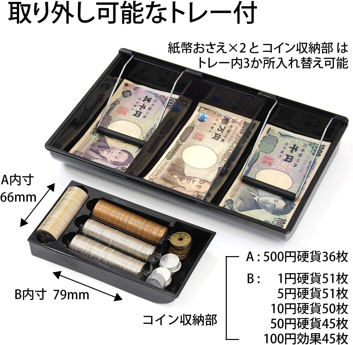 [Features] 1. Set your password freely You can register any number by yourself as a password from 1 to 8 digit 2.Large and easy to read push keys Large electronic lock push key for easy reading without mistakes. After unlocking the electronic lock, you can open and close it with a lever operation. 3. Can be unlocked by a key. Even if you forget your password code, you can unlock it with a lock for peace of mind. 4. Convenient tray for bills, currency and small items. The included tray has a divider for convenient organizing coins and small items. Coin storage compartment is 3.2 inches (81 mm) wide x 1 row, 3.5 inches (89 mm) tall x 4 rows. (When using width 3.2 inches (81 mm) = 36 x 500 yen coins). (When using the vertical 3.5 inches (89 mm) = 51 yen coins, 51 5 yen coins, 50 yen coins, 45 50 yen coins, 45 100 yen coins). Does not have coin counter function. 5. With signal lamp Press the push key to unlock the red lamp and blue light will light up during unlock, making it easy to understand. If you repeatedly set the number 4 times, the alarm will last for 1 minute, and the red light will flash. 6. Battery drain warning buzzer function When the battery runs out, the buzzer will sound when you unlock it, so you can easily understand when the battery is replaced. Even if you change the battery, the password can be retained as the last register. Please do not place the keys inside the safe Please do not store the instruction manual inside the electronic lock safe ※It is guaranteed to lock when the lid is closed. Please be sure to check out the notebook, etc. If you forgot your password or lose your key, it cannot be opened until you are ready for the matching key. This product is not fireproof and waterproof. Please do not use rechargeable batteries.