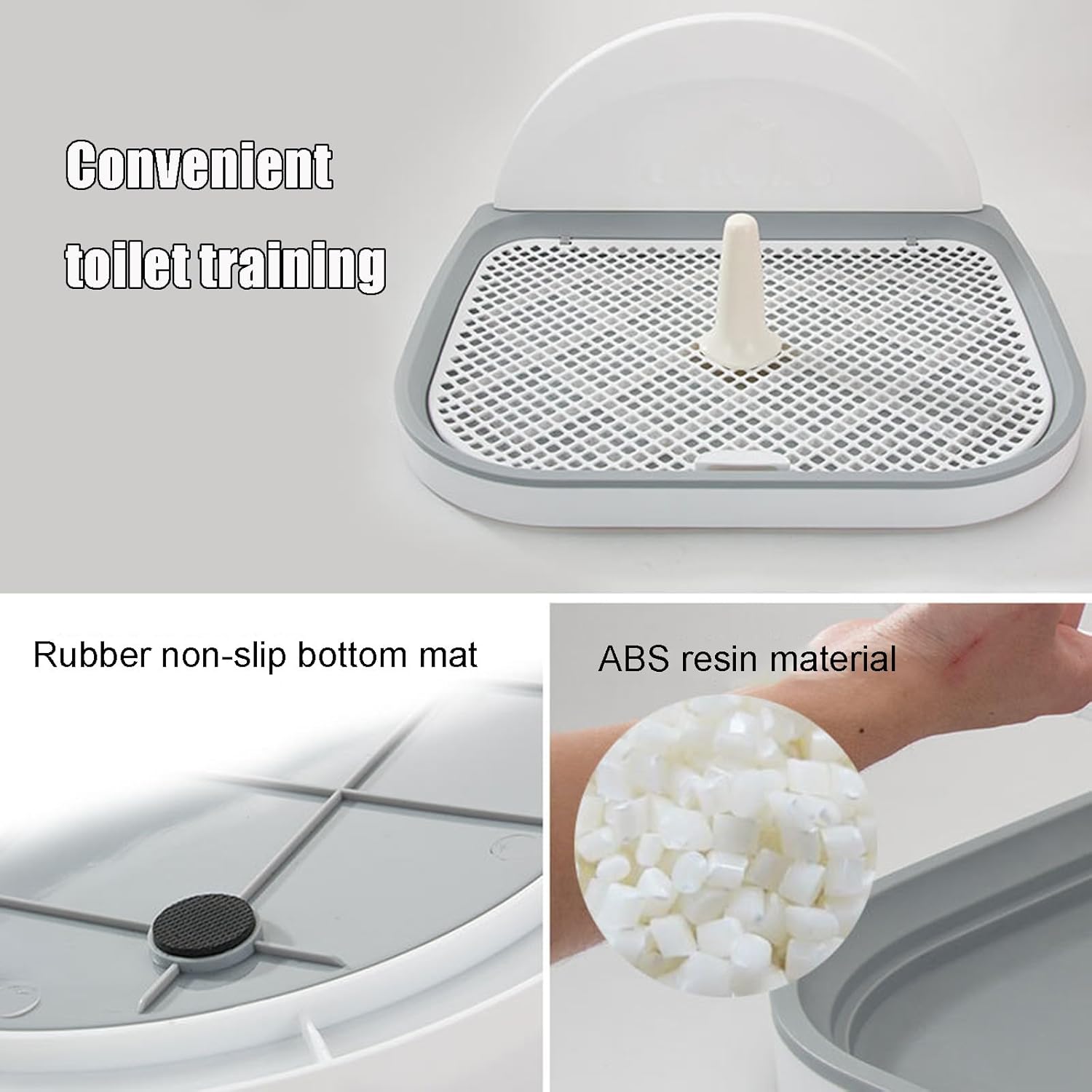 Easy to cleanABS resin material, easy to handleToilet Training ConvenientThe wall setting is convenient for dogs to adapt to the regular toilet as soon as possibleExquisite workmanshipCarrying clip, easy to open and closeRubber non-slip bottom matRubber non-slip bottom mat, wear-resistant and non-slipProduct Name: Dog ToiletMaterial: ABS resinSize: 57x45x4.5centimetre/22.4x17.7x1.8"Product list: dog toilet x1, urine pole x1Attention Tips:1.Due to manual measurement, there may be 1-3centimetre error.2.Due to monitor and other factors, there may be slight colour differences.
