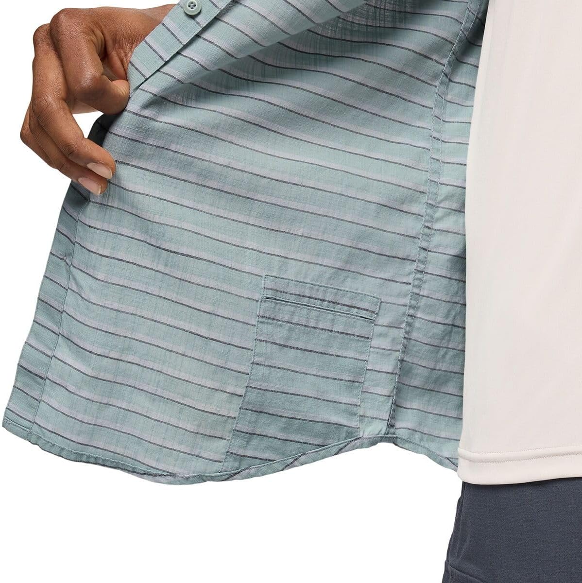 Sandbar/Aqua/Cove yarn dye plaid • Rust/Clear Sky Stripe yarn dye stripe • Self-fabric weight: 105gsm • Front left chest pocket • Interior side seam stash pocket • Back yoke • Exterior prAna woven label at front left hem • Faux corozo buttons