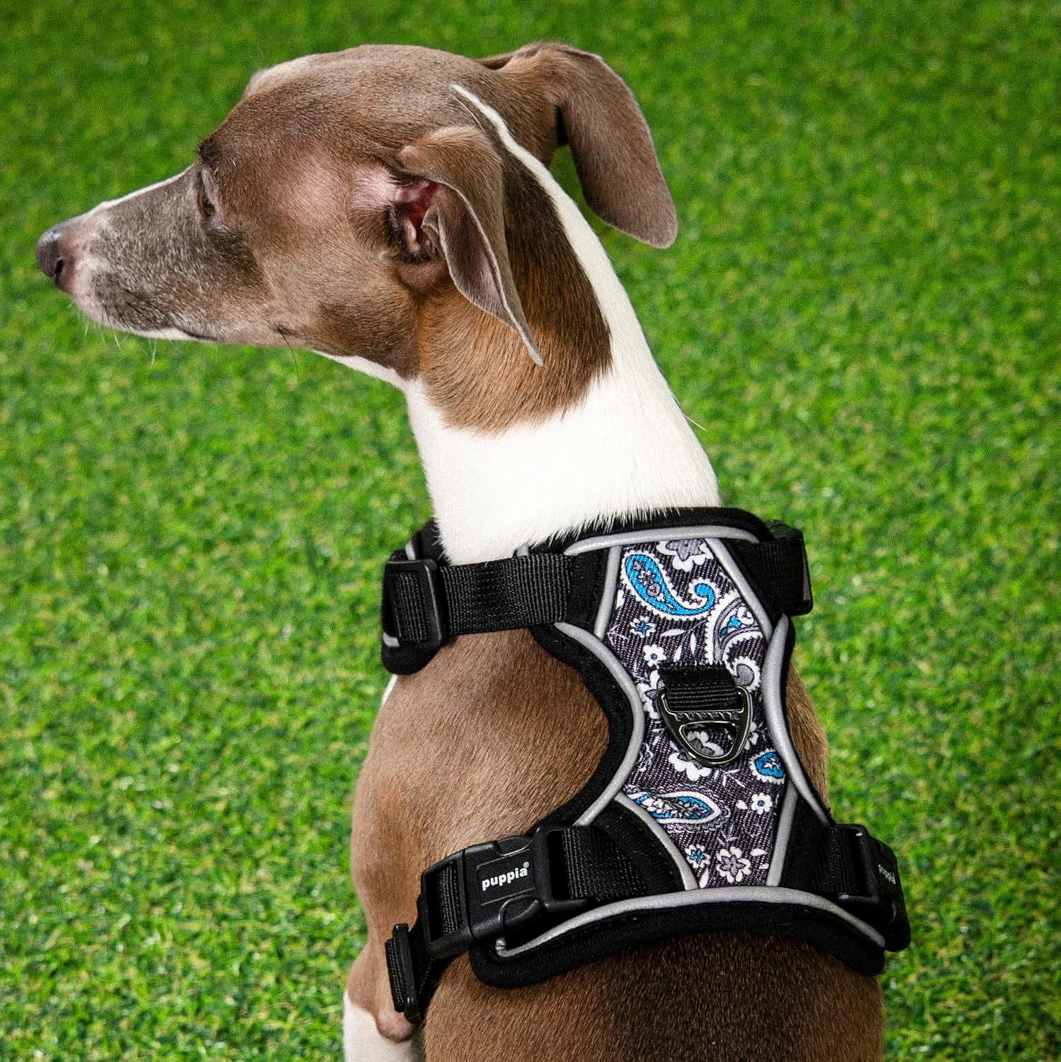 The Cynthia Harness H features a flower pattern and solid schemed, reflective straps, and Front and Back D-rings for lead attachment, and Puppia rubber label on the chest. It is a sturdy dog harness that is adjustable neck and chest with a buckles and straps. Available in Black and Blue in sizes ranging from Small to XX-Large. Note: Unlike human clothes, pet apparel designers have different sizing characteristics. Please do not purchase a Puppia harness based on the size of another manufacturers/designers.