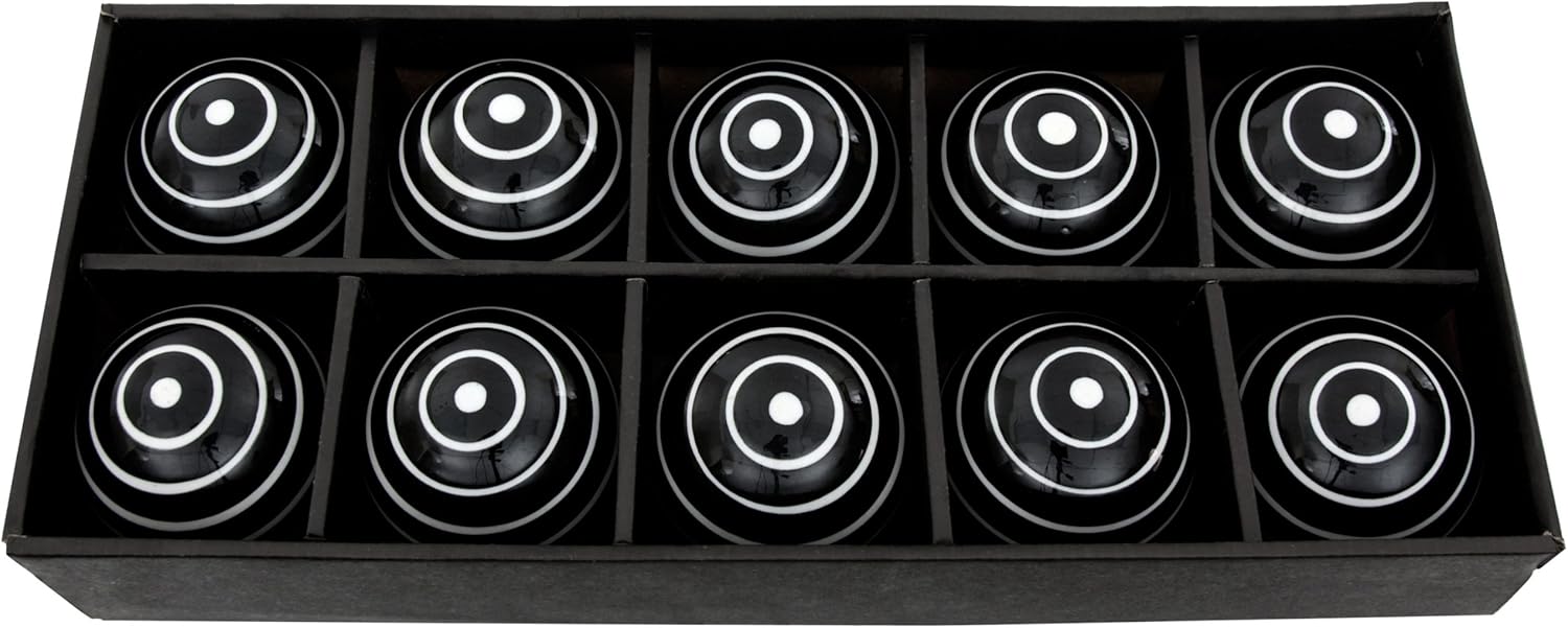 A stylish accent for display as a centerpiece or in a cabinet, this set of ten porcelain balls is a great way to add interest to your home decor. Featuring bold white stripes on black backgrounds, these spheres add a modern decorative touch to the room and make a great gift. Woven rattan display basket is not included.