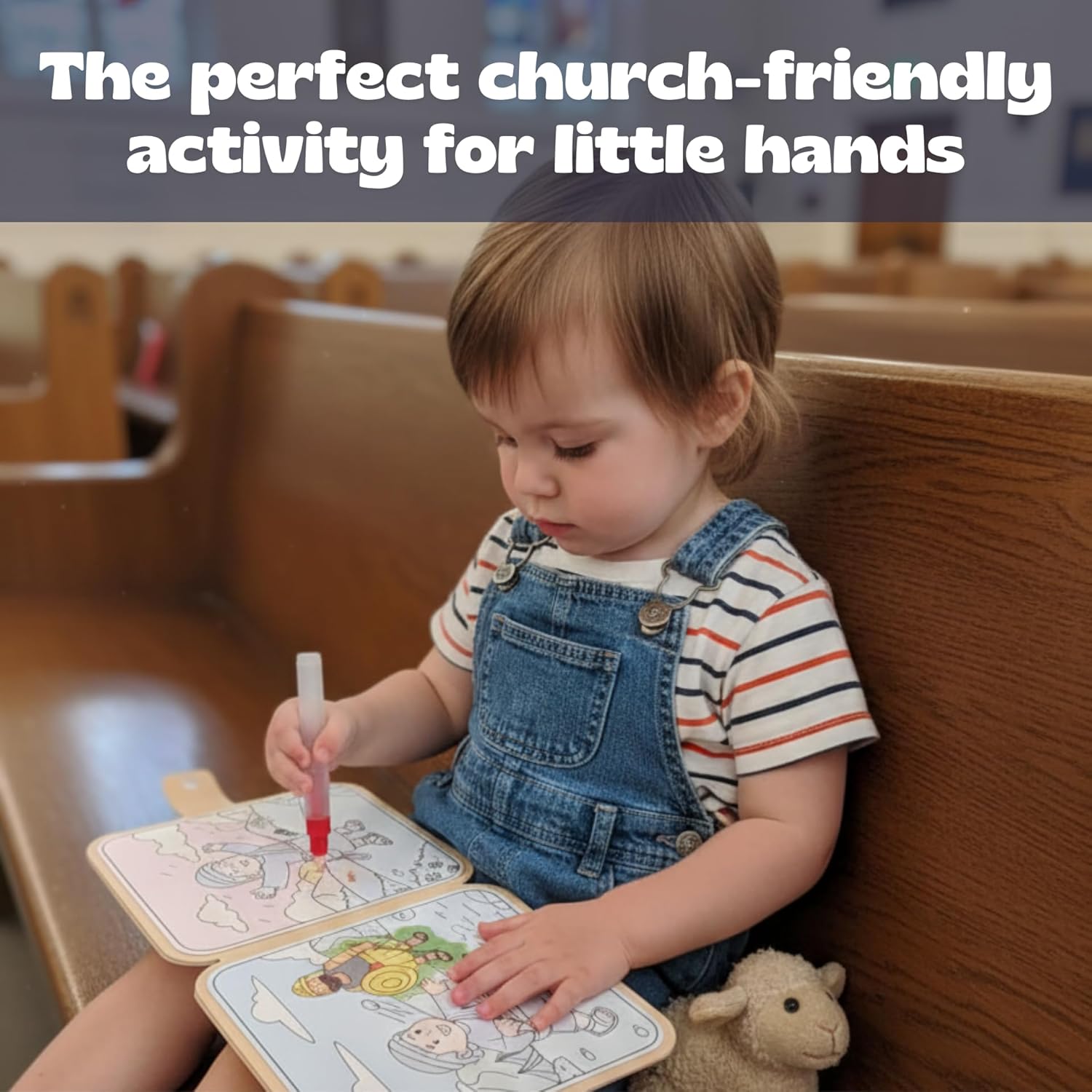 Make Bible time fun and interactive with this Reusable Bible Story Water Coloring Book Bundle. Each set includes three activity books and three refillable water pens, designed for children ages 3 and up. Kids will explore five beloved Bible stories - Noah’s Ark, Jonah and the Big Fish, David & Goliath, Daniel in the Lion’s Den, and the Christmas story of Christ’s birth - through over 25 reusable coloring scenes. Simply fill a pen with water, brush across the pages, and watch hidden illustrations appear in bright color. Once the page dries, the image fades, ready to be colored again. No messy paints, crayons, or markers needed. Lightweight and portable, these books are perfect for at-home play, travel, church, or Sunday school. With bold outlines, friendly artwork, and engaging Bible themes, this set helps little ones learn God’s Word in a way that’s fun, creative, and hands-on. These books include our updated water-pen design, created to be more child-safe and convenient. The pens now feature a no-cap, leak-resistant construction, making them perfect for travel, church, and hands-on learning with young children. Whether as a gift, homeschool resource, or classroom activity, this Christian coloring set is a wonderful way to encourage both imagination and faith in young learners.