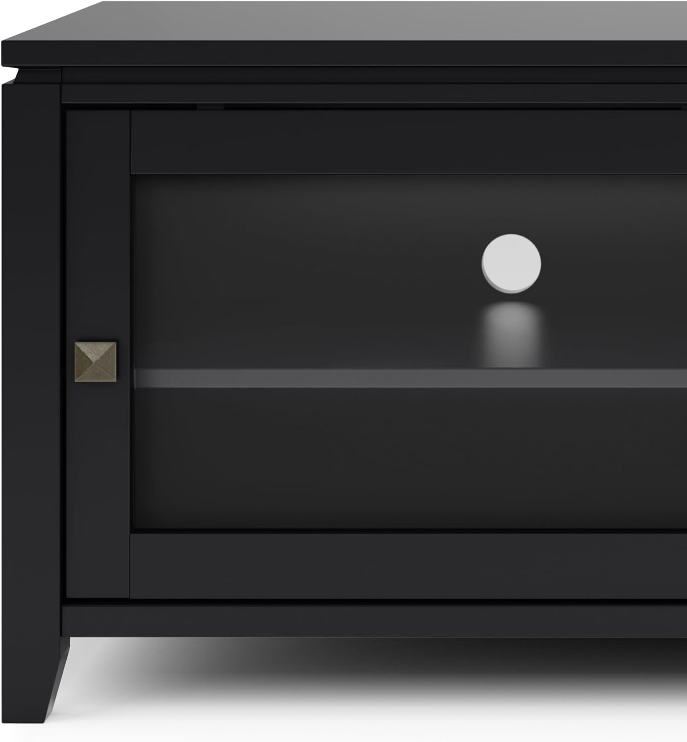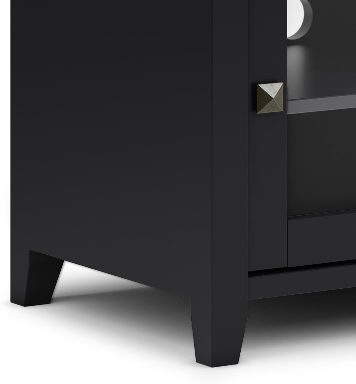 Compact in size but big on style, the Cosmopolitan 48-inch Wide Solid Wood TV Stand offers the perfect balance of modern design and practical storage. Expertly handcrafted from durable solid wood and finished in a smooth black tone with a protective NC lacquer, this media console combines clean lines with lasting quality. Two sliding tempered-glass doors reveal adjustable shelving to organize streaming devices, gaming consoles, or decor while keeping them protected and dust-free. Built-in cord cutouts maintain a clutter-free setup, and the floating top design paired with bronze-finished hardware and square tapered legs lends a refined, minimalist edge. Designed for TVs up to 55 inches, this compact console brings timeless sophistication to smaller living rooms, apartments, or bedrooms, proving that modern elegance fits beautifully in any space.