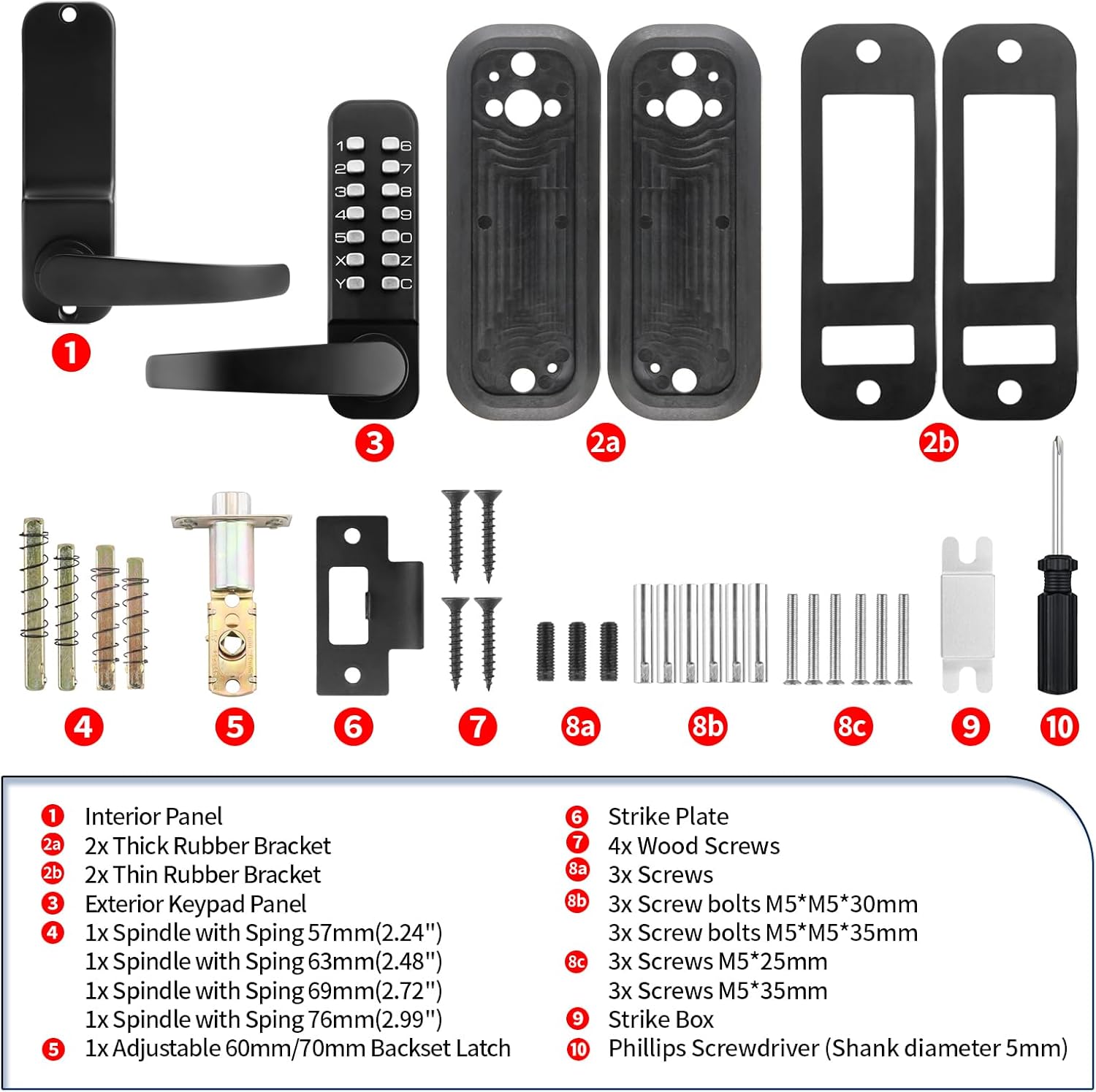 | Included Components | Exterior Panel with Lever,Interior Panel with Lever,Spindle,60mm Latch,Strike Plate,Strike Box,brass Keys,Rubber Seal,Instruction Manual,Screw pack |