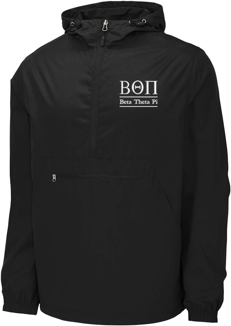Beta Theta Pi pullover anorak. This weather - fighting essential packs into its own front pocket - making it easy to throw into a gym duffel, etc. This windbreaker is embroidered with the Beta Theta Pi letters and name over the left chest. Machine wash cold. Gentle cycle with like colors. Use mild detergent and remove immediately. Do not allow to lay on itself when wet. Do not bleach. Tumble dry low. Cool iron, if needed.