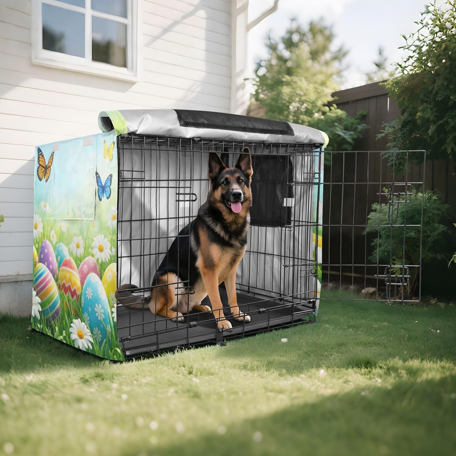 Premium Protection – Constructed from 600D silver-coated oxford fabric, this travel crate cover offers excellent protection from rain, wind, and sunlight. It helps prevent scratching and keeps your pet’s crate protected from external elements.Quick Setup – This pet kennel cover is designed for easy installation, with a simple fastening system that ensures a secure fit without the need for tools or extra help.Mesh Windows for Comfort – This travel dog crate cover includes mesh windows on all sides, promoting airflow to keep your dog cool and comfortable while providing privacy and a sense of security inside the crate.Secure and Stable – With four tie-down straps at the bottom, this crate cover remains securely in place, even during windy conditions. This feature ensures that your dog’s crate is stable and protected from the elements.Flexible Usage – This dog crate cover is suitable for both indoor and outdoor use, making it a Ideal solution for protecting your pet's crate whether at home, during travel, or on outdoor adventures.