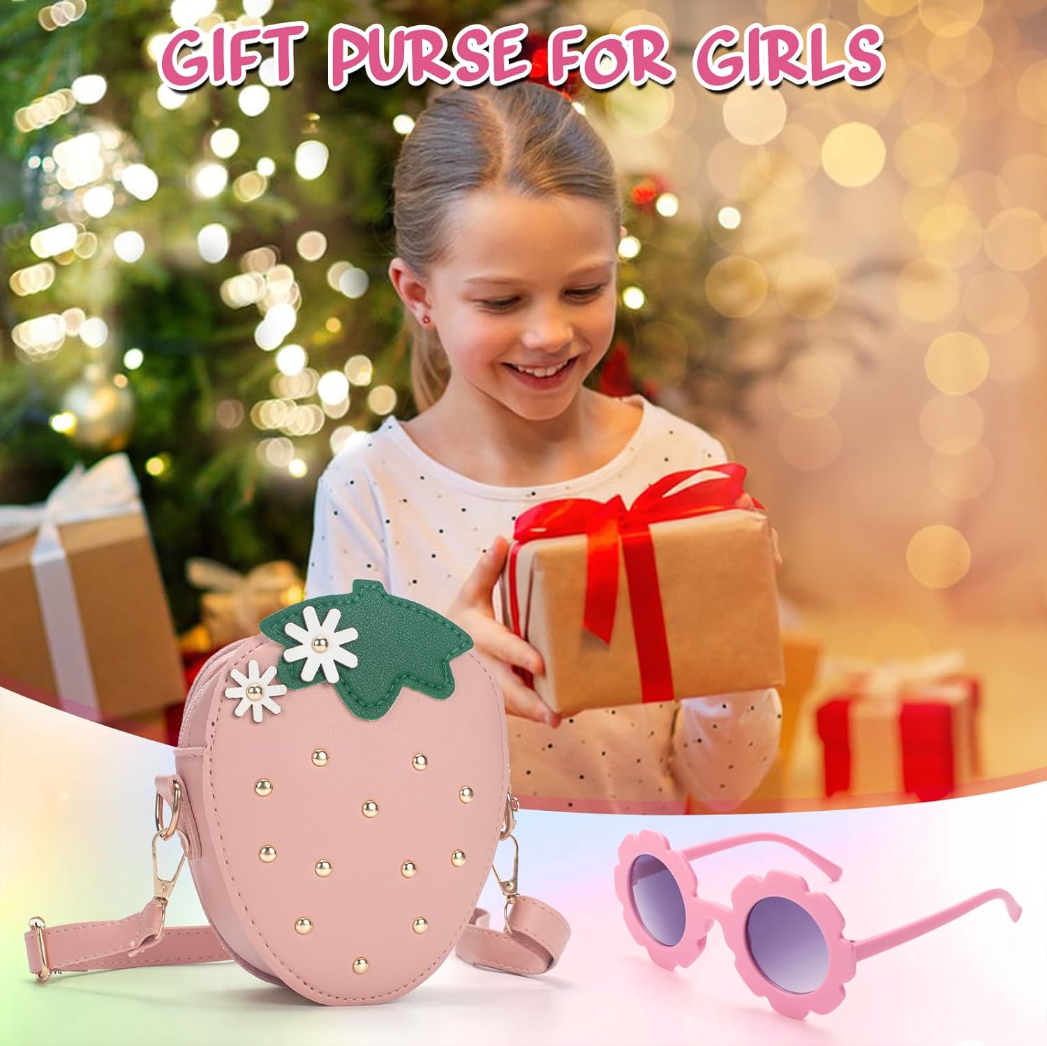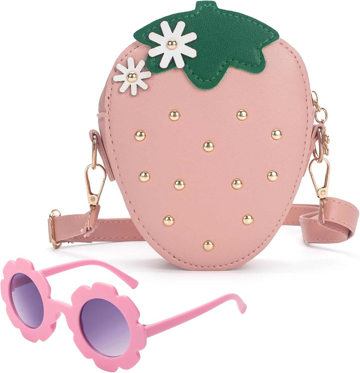What You Will Get:1 strawberry purse, 1 pair of floral glasses. Crafted from premium PU leather and adorned with stylish metal rivets, our Cute toddler purse promises durability and a soft touch. Resonable Size: This strawberry bag measures approximately 5.51" (L) x 4.72" (W) x 1.96" (H), This adorable fruit-shaped purse offers ample space for your princess’s essentials like snacks, small toys, hair accessories, keys, and more. Charming Design: Featuring a cute strawberry shape and embellished with delightful flowers and rivets, this kids crossbody bag combines a playful punk style with whimsical charm. It’s a unique accessory that will make your sweetie stand out on any occasion. Adjustable Shoulder Strap: The girls purse comes with a detachable and adjustable shoulder strap for easy customization to your child's height. Whether worn as a crossbody or shoulder bag, this toddler wallet offers convenience and style for every little fashionista.