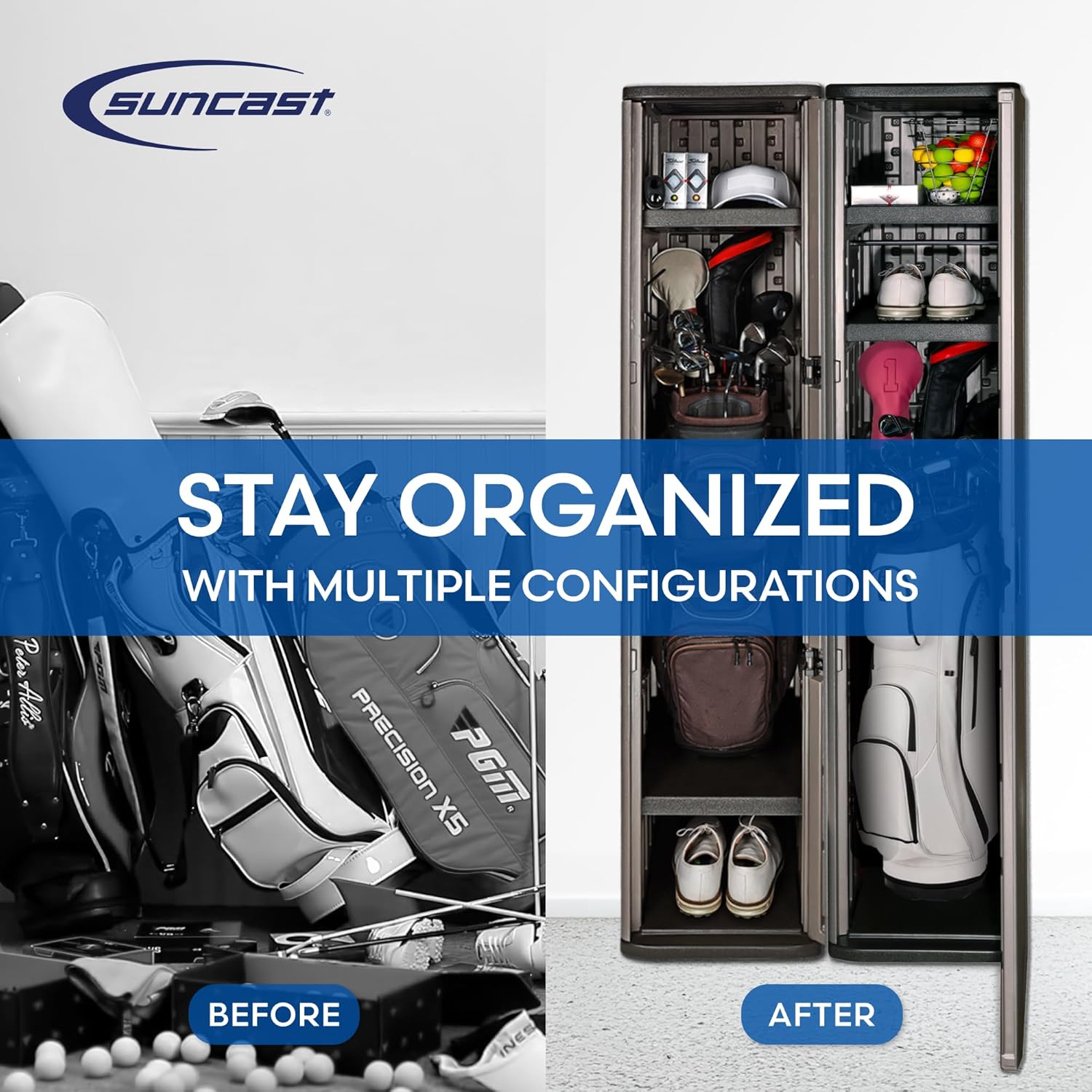 Organize your garage or entryway with the Suncast Golf Storage Cabinet, perfect for golf and sports gear. It features a hall tree with a coat rack and shoe cubby, ideal for golf equipment and bags. Made from heavy-duty resin, it’s water-resistant, rustproof, and scratch-resistant. Adjustable shelves and lockable doors offer secure, customizable storage. With 8 cubic feet of space, it keeps your space tidy and organized