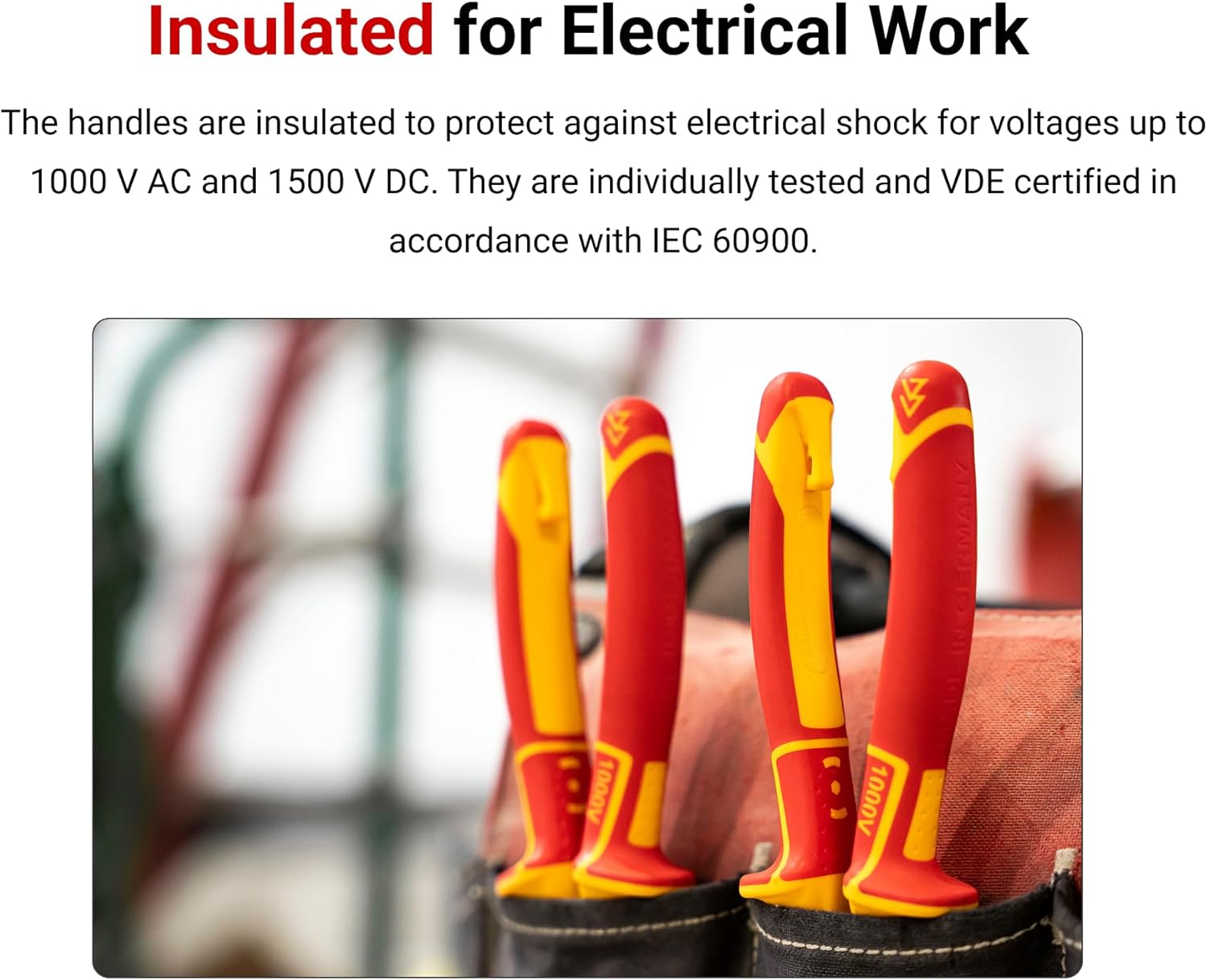 Tekton insulated pliers and screwdrivers have insulated handles to protect against electrical shock for voltages up to 1000 V AC and 1500 V DC. This set includes combination, long nose, and diagonal cutting insulated pliers and Phillips (JIS compatible), slotted, and square insulated screwdrivers. The jaws on the combination pliers have six work zones: a wire cutter for fast, clean cuts, flat tips for even clamping, hex-grip teeth for turning hex bolts, coarse teeth for an aggressive bite, fine teeth for controlled gripping, and a wire groove for holding a single wire. The jaws on the long nose pliers have five work zones: serrated surfaces at the tip for controlled gripping, smooth surfaces in the middle for non-marring clamping, coarse teeth for an aggressive bite, a knife-to-knife wire cutter, and hex-grip teeth that can turn bolts in a pinch. The diagonal cutting pliers have a 0.9 inch cutting capacity for a variety of wire and cable sizes. On the screwdrivers, the shank diameter is reduced so the insulation can be molded flush with the tip, giving you access to screws in narrow, recessed holes. Each driver has the tip size engraved in three locations with high-contrast laser markings. The handle is molded around the shank, creating a solid connection that is stronger and straighter than simply pressing the shank into a premade handle. The tip is precisely machined and coated with black manganese phosphate, creating a slightly rough surface that enhances screw engagement.