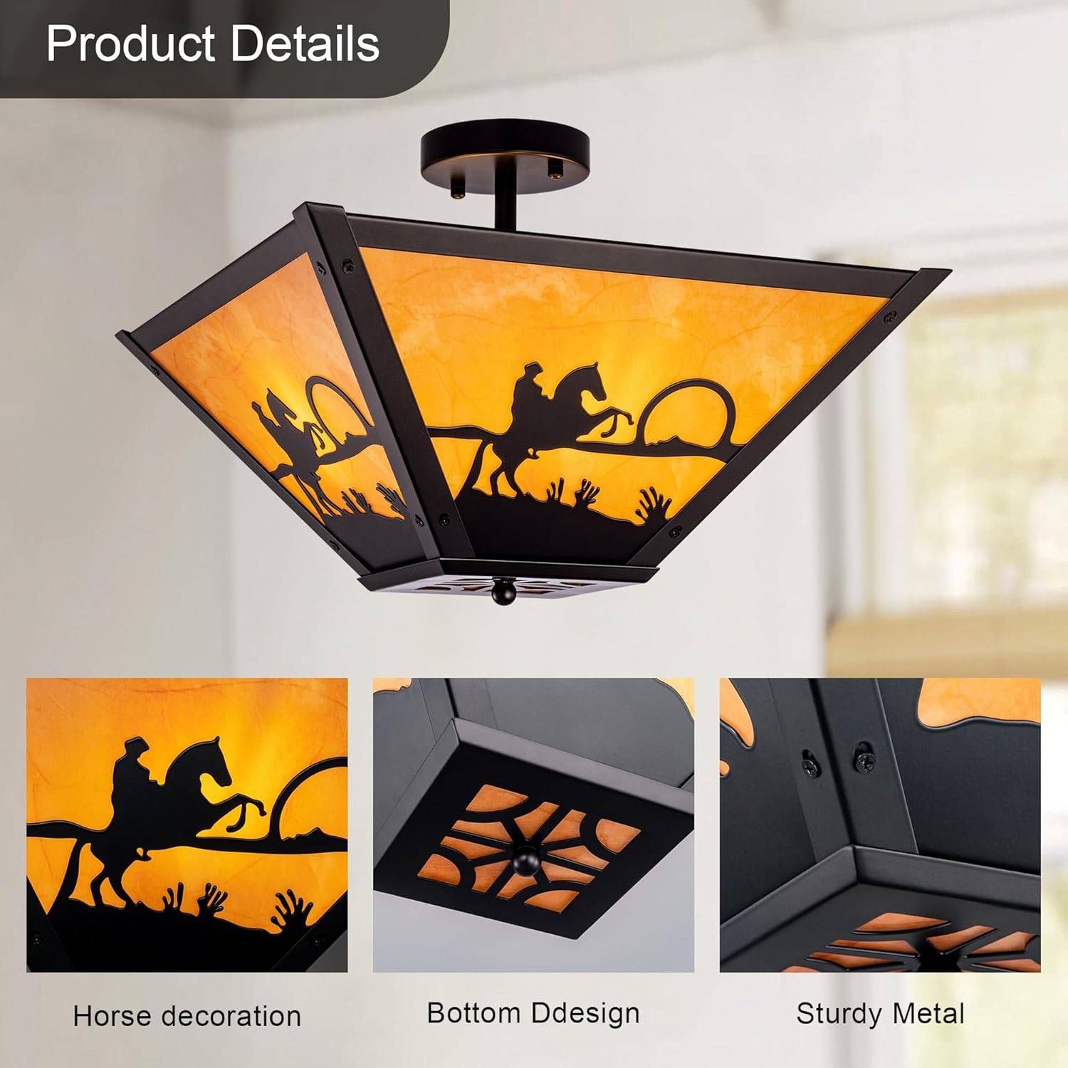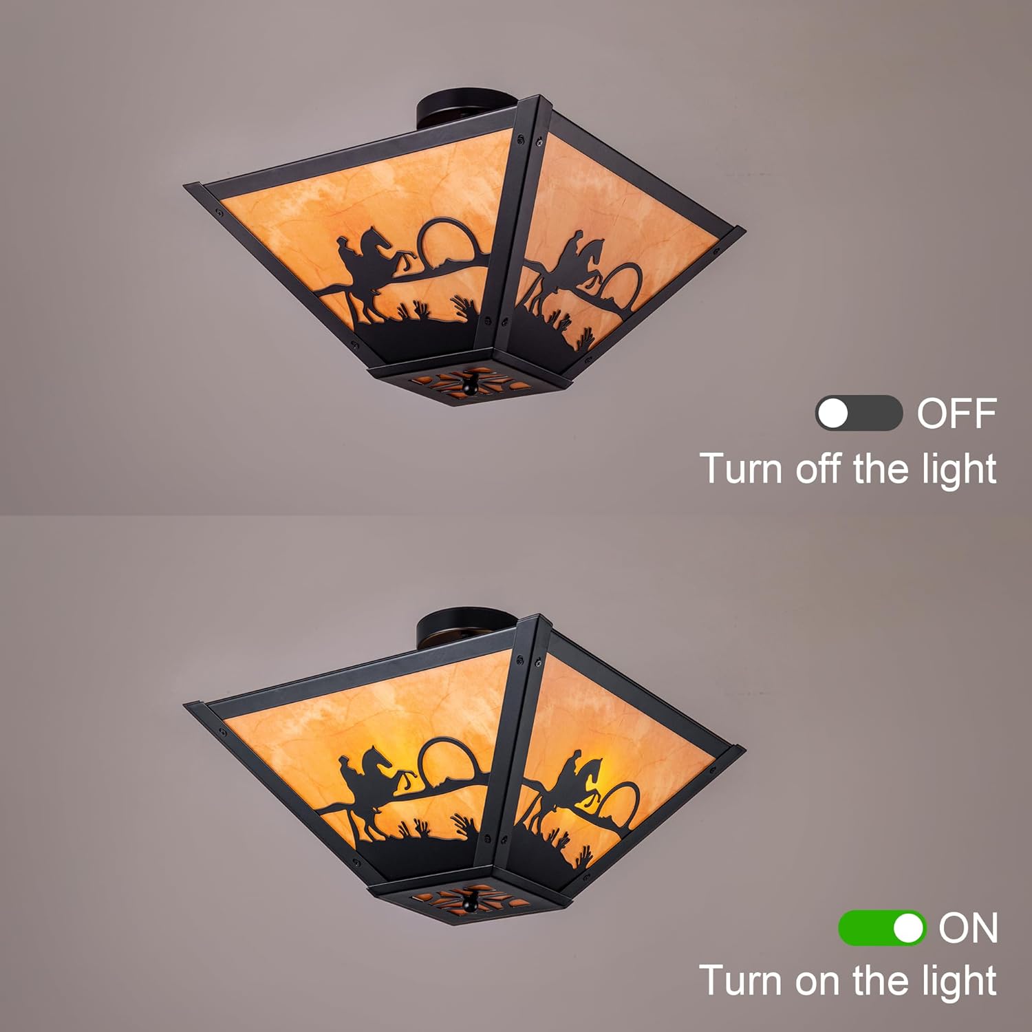 • Vintage Ceiling Light: This rustic ceiling light fixture features a cowboy pattern and is made of metal cutting. The black corrosion-resistant finish emphasizes the black forest style decoration, and the vintage acrylic board adds a warm farmhouse style, adding a touch of unique art charm to your cabin