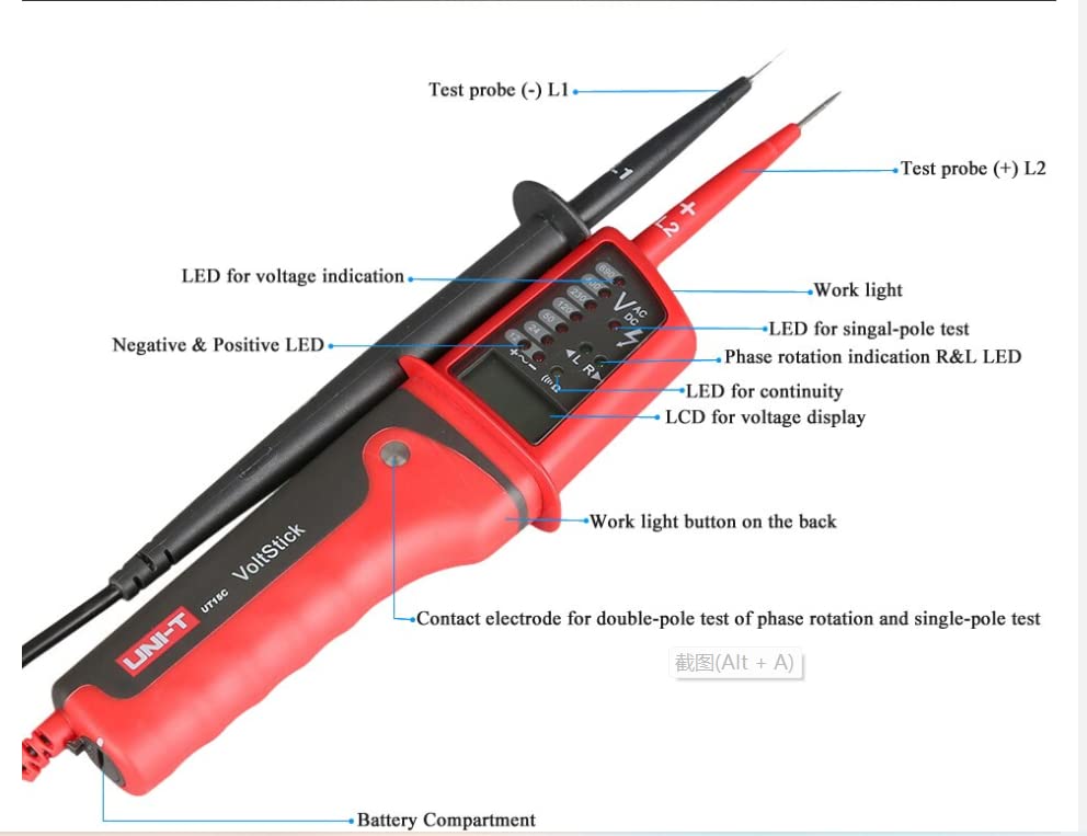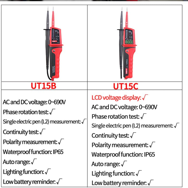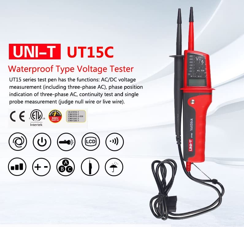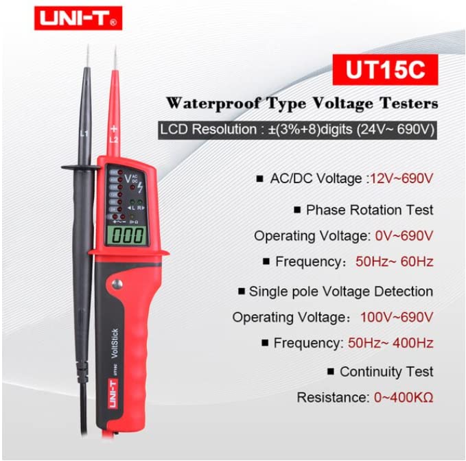 UT15 Series Waterproof Type Voltage Tester●UT15 Series test pen has the functions: AC/DC voltage measurement (include three-phase AC), phase position indication of three-phase AC, continuity test and single probe measurement (judge null wire or live wire). It can also solve the complex problems of electric, factory automation, etc. ●Models in UT15 Series: UT15B, UT15C●Features of UT15 Series Waterproof Type Voltage Tester●● AC/DC voltage measurement●● Continuity test●● Single probe measurement●● Phase position indication of three-phase AC●Phase rotation test Operating Voltage: 0V~690V √ ●Frequency: 50Hz~60Hz ●Single lead (L2) voltage detection Operating Voltage: 0V~690V √ ●Frequency: 50Hz~400Hz ●Continuity test Resistance: 0~100kΩ √● Beeper and LED light Indicator ◆Polarity detection Positive & Negative √ ●Features◆●Water-proof (IP65) √ ◆Auto range √ ●Work light √ ●Low battery indication Short circuit two leads, LED and beeper off when the bettery is low √