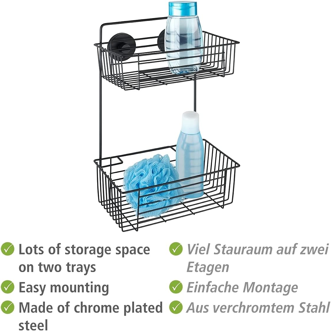 The trendy bathroom series Vacuum-Loc Bari Black in trendy industrial style gives rooms that certain something. With their straightforward design and strong presence, the accessories create the ideal contrast to bright baths. The Bari bathroom range made from matt black painted steel offers a wide range of spacious wall shelves that provide additional storage space in the bathroom. All toiletries and bathroom accessories keep the attractive bathroom shelf on two generous shelves always at hand. The practical dimensions of the wall shelf and its modern, black loft look allow it to be integrated into almost any bathroom to save space, unobtrusive and according to your own wishes. The unique Vacuum-Loc system allows quick, easy and safe attachment of the accessories to all airtight and slightly uneven surfaces. The innovative Vacuum-Loc system consists of a pump and fixing locs, it does not need to be drilled or screwed, even suction cups are not necessary. The installation of the Vacuum-Loc system is very easy with the help of the pump. By extracting the air using the supplied pump, a vacuum is created in the loc and the adapters with the accessory are immediately resilient. The vacuum locs can be repositioned as often as you like and removed without leaving any residue. The Vacuum-Loc system has European patent protection and ensures a secure hold. Each mounting loc is each permanently loaded with a tensile force of up to 33 kg. This describes the force force, which pulls horizontally on the mounting loc, so acts towards the power generator.